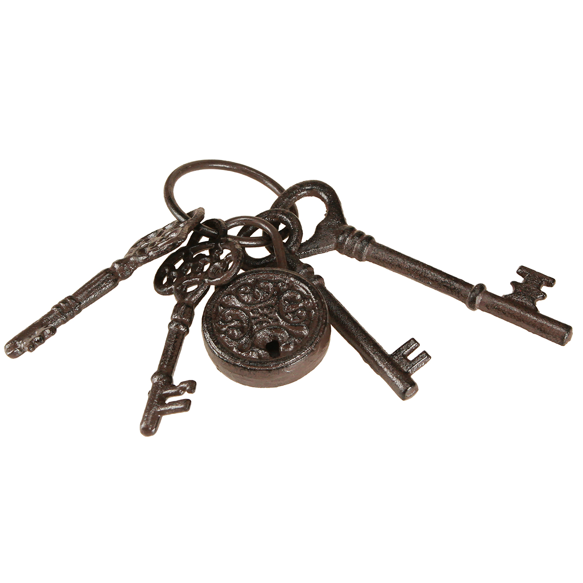 Finomítsa vintage dekorációját ezzel az eredeti kulcstartóval, amely barna színű fémgyűrűn van! Az egyes kulcsok és a gyűrű ebben a függesztett vagy asztali dekorációban öntöttvasból készült. Az egyes elemek sötétbarnára vannak festve, ami a csúszásmentes patinát is létrehozza a felületen. Emiatt a dekoratív kulcsok és a zár mesterségesen öregítettnek tűnnek, amit az egyes szakállak vintage dizájnja is tovább erősít.