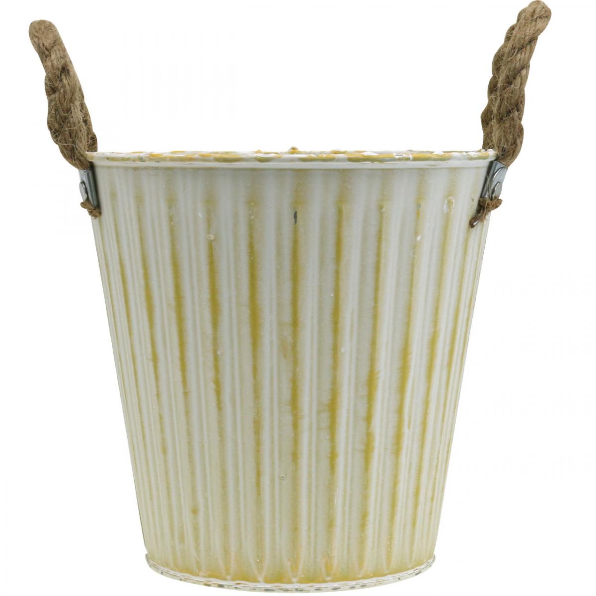 Ez a fémből készült edény tökéletes a tavaszi dekorációhoz: pasztellsárga színben, a juta zsinórból készült fogantyús virágtartó fehérre mosva érkezik, trendi kopott sikkesben.
