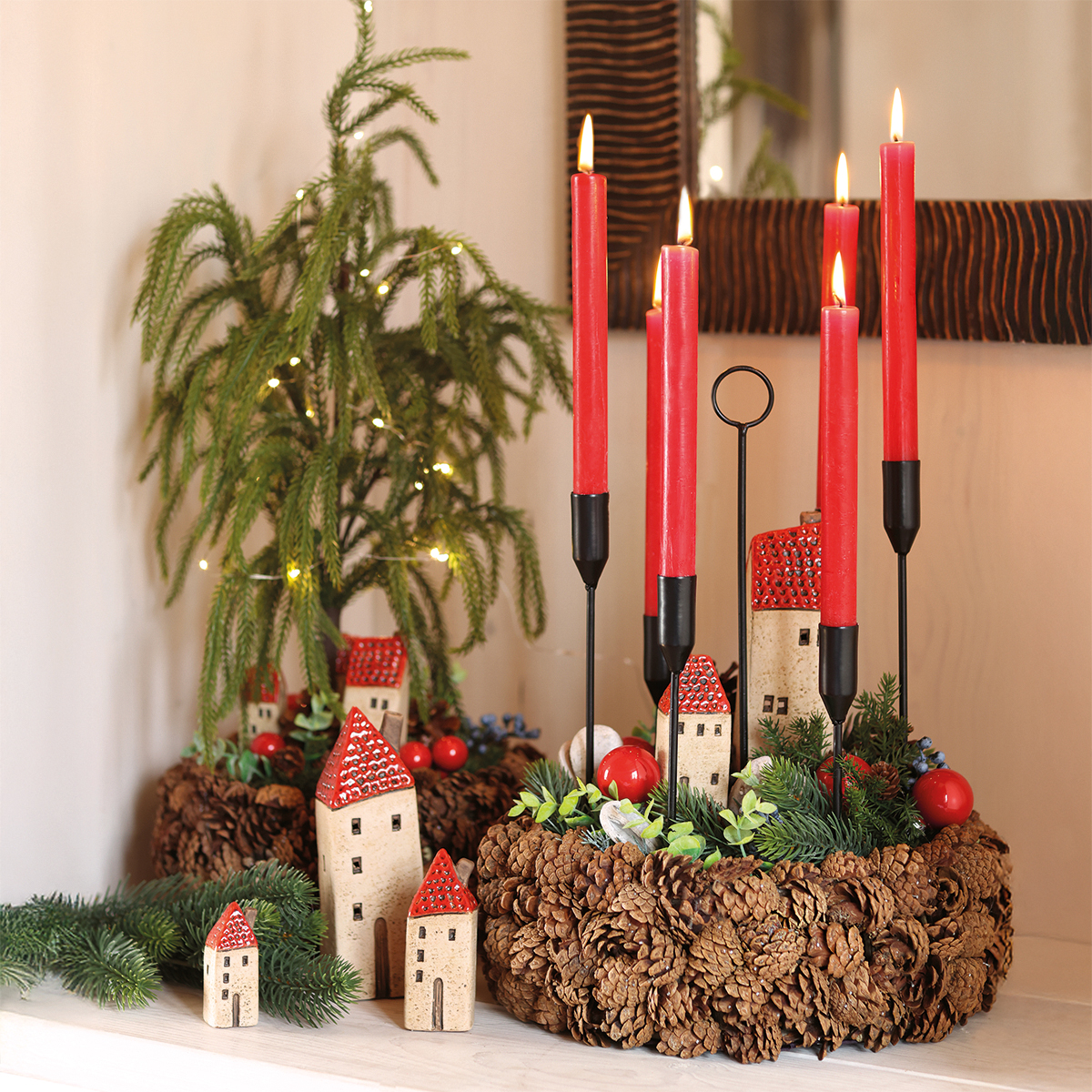 - Alkoss ünnepi adventi dekorációt a gyertyatartó, a Floristik24 kínálatából származó fenyőágak és apró díszek kombinálásával.
