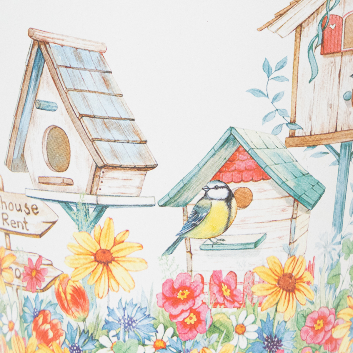 Ez a bádogvödör nyomtatott fóliával van bevonva, amelyen színes virágtenger látható három különböző fészkelőládával - néhány madár is látható.