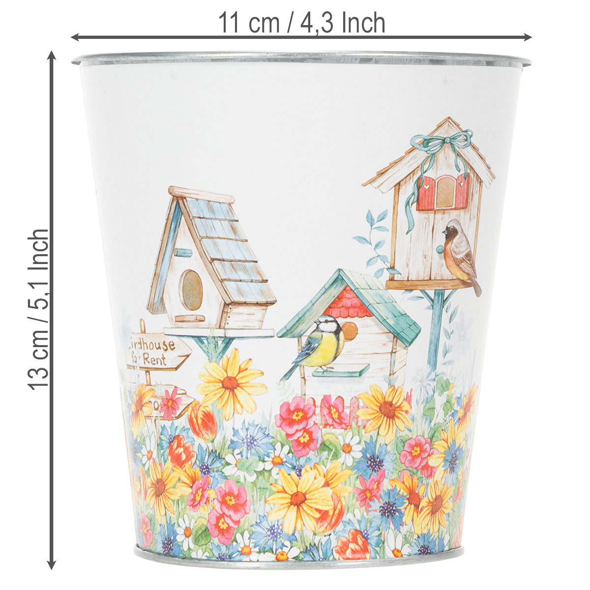 Ha szeretnél egy kis színt adni kertednek, használj mintás fém edényeket, például ezt a csinos, madárházas cserepet!
