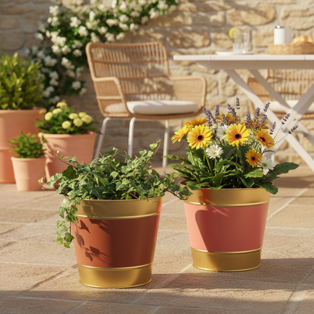 Ez a négy cserepből álló készlet arany peremmel és nagyszerű színvilággal inspirál majd. A fém virágcserepek divatos barna, bézs, rózsaszín és barack színekben kaphatók.
