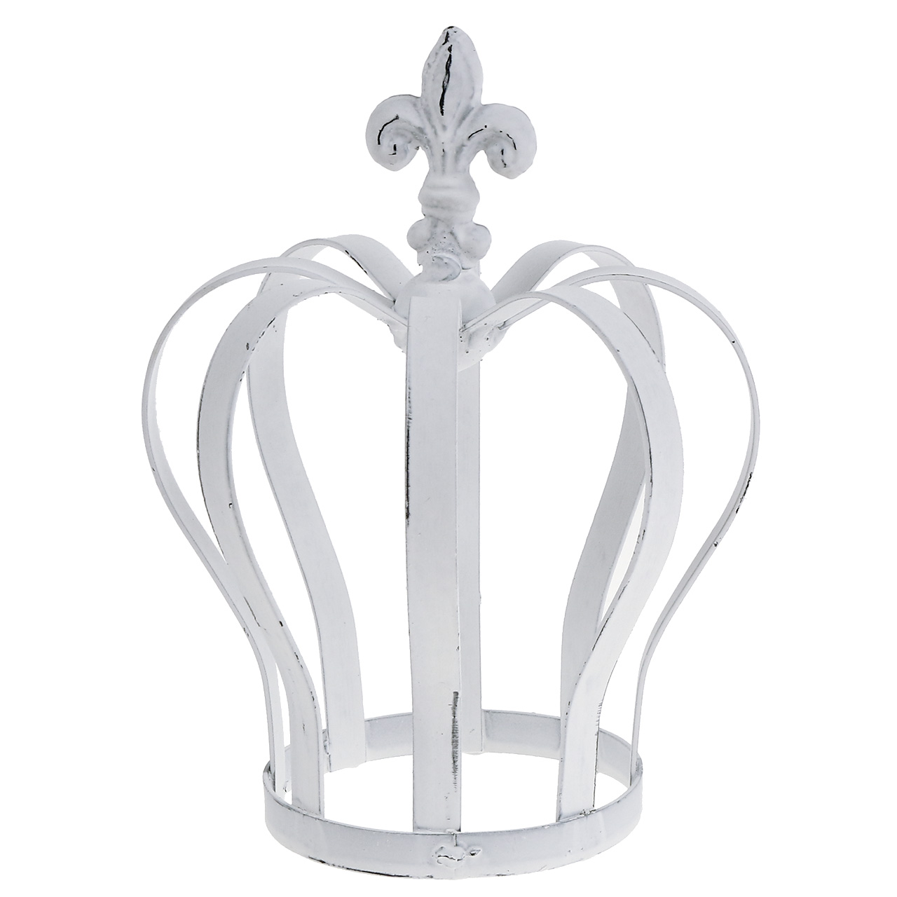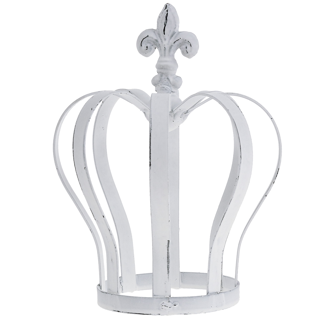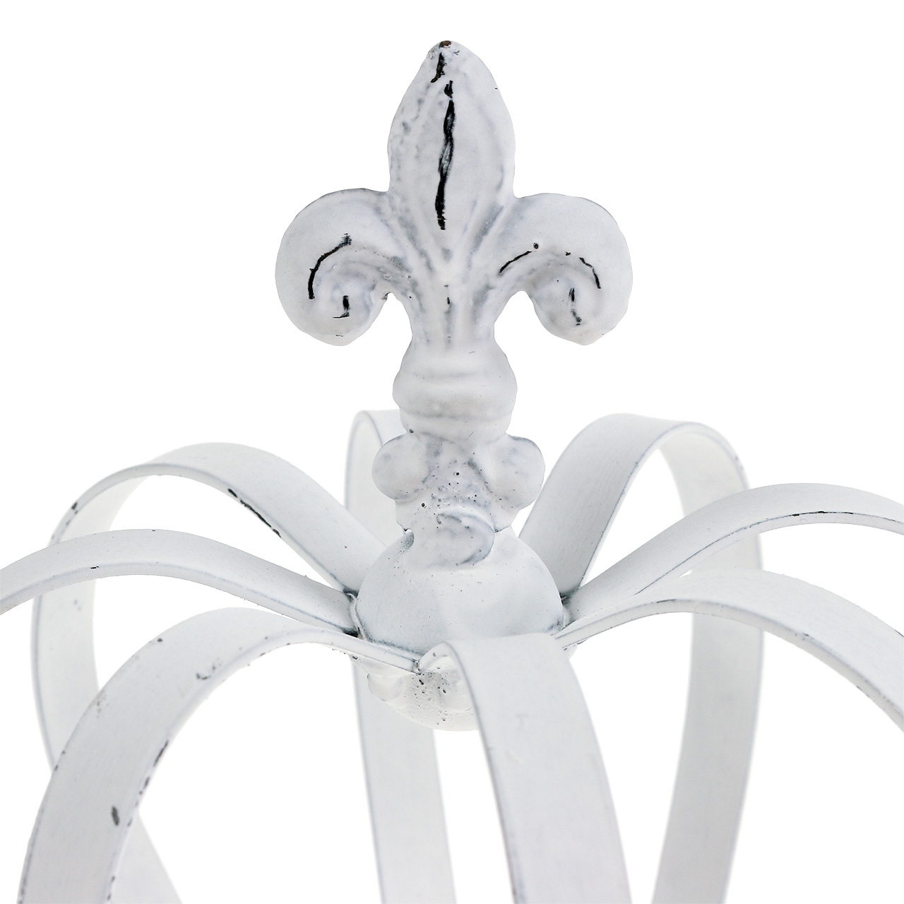 Minden belső és külső dekoráció abszolút megkoronázása: antik fehér fém korona! A masszív fémből készült korona fehér, matt bevonattal van ellátva, amely csak részben átlátszatlan, így vintage megjelenést kölcsönöz a koronának, és jól illik a kopott elegáns dekorációhoz. Az íves fémrudak felül díszben végződnek.