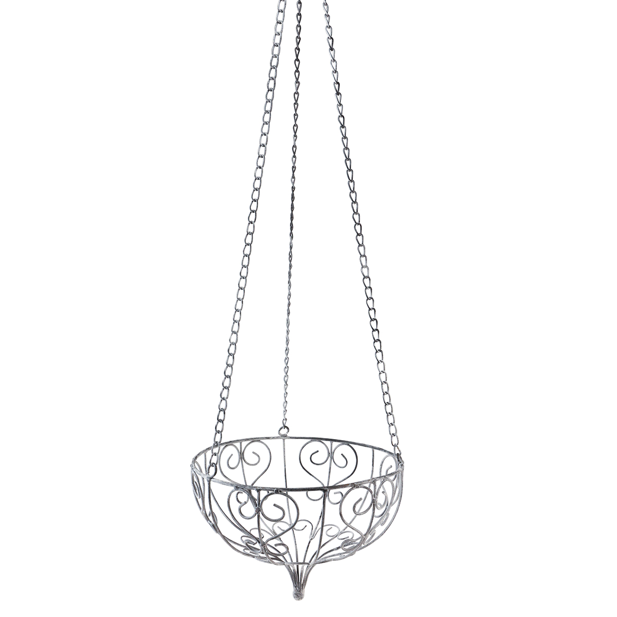 A fémkosár tál alakú, amely az alján összeállva kerek hegyet alkot, mint egy antik dekoráció. A fémkosár három láncon van stabilizálva. A tetején egy kampó köti össze a láncokat, amivel aztán felakaszthatod a fémkosarat a mennyezetről.