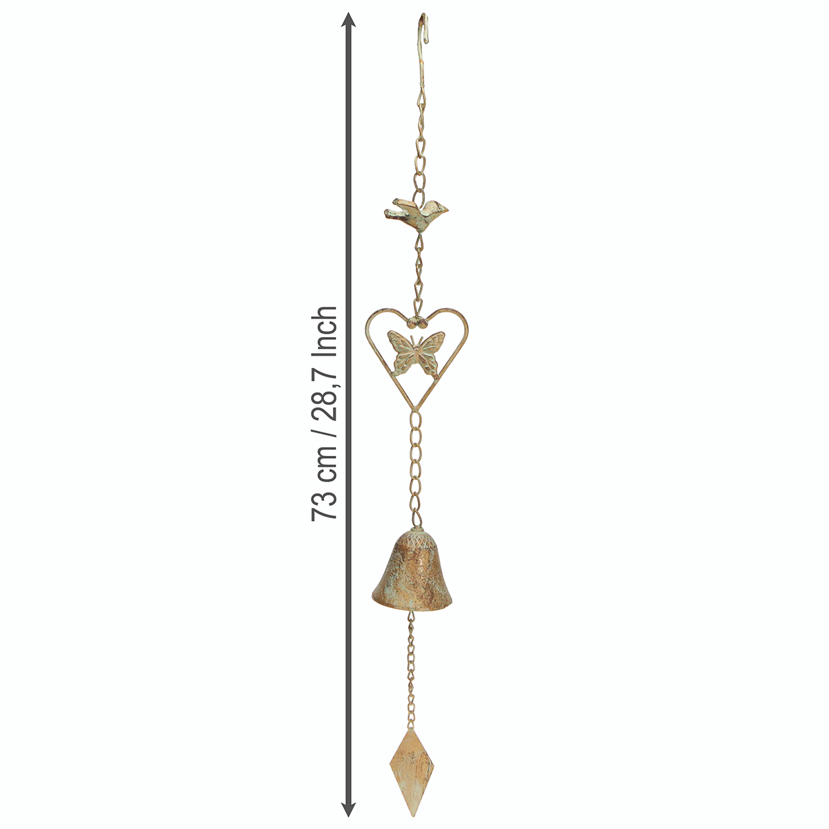Fém szélcsengő szívvel és harangos kerti dekorációval antik 72cm
