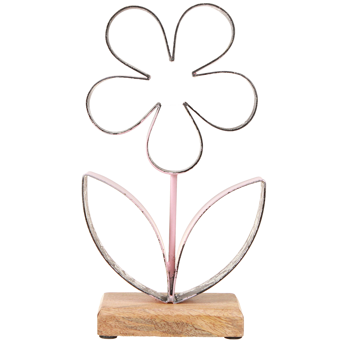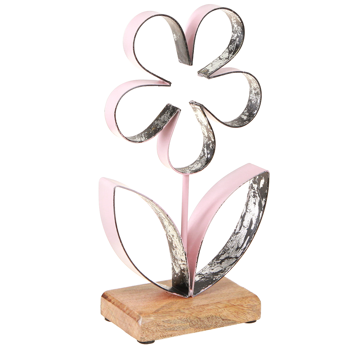 Fém virág rózsaszín és ezüst színben, természetes fa alapon - egy vintage dekoratív állvány tavaszra