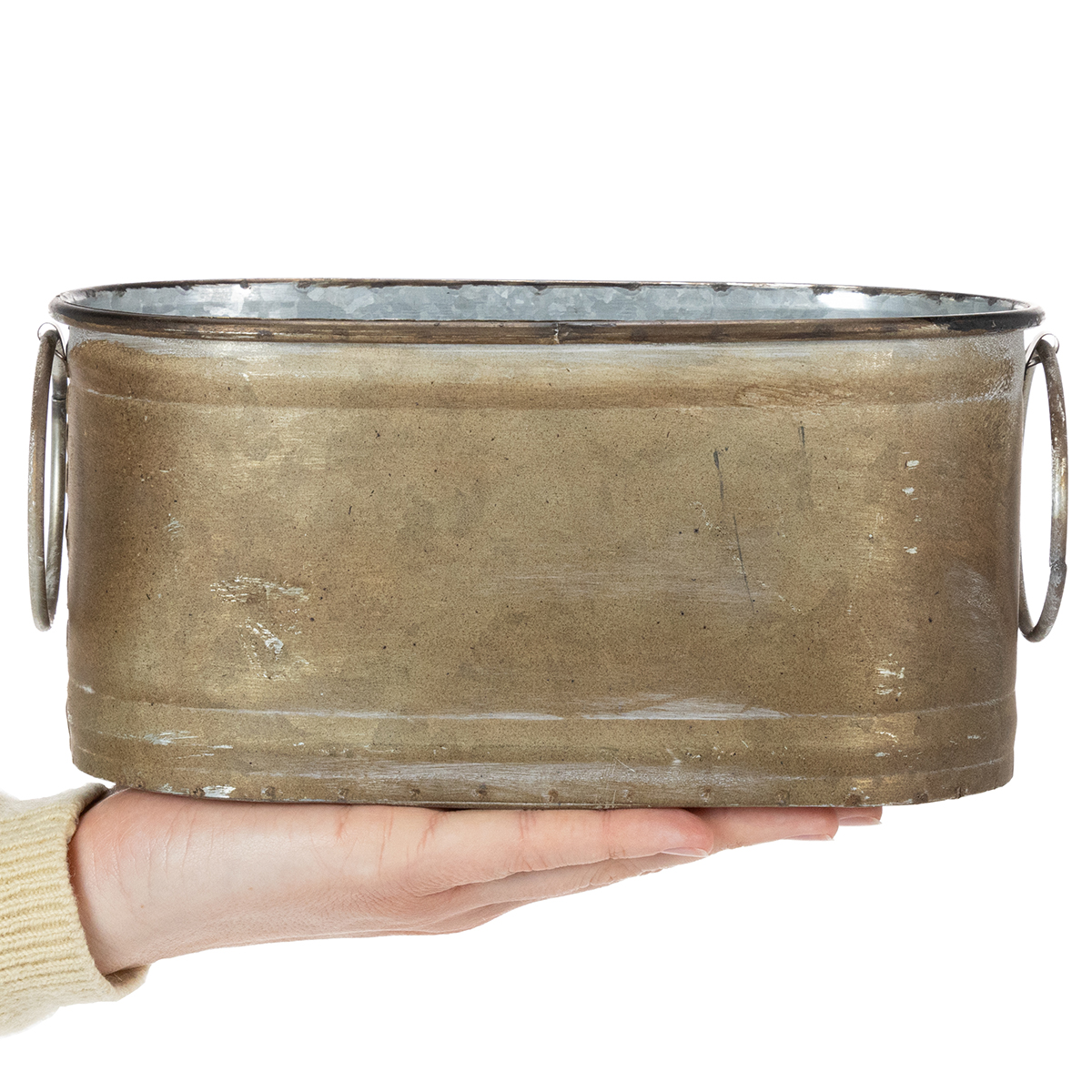 A 3 db-os készletben található cachepotok kis kád alakúak. A fém kádak külseje rézfehérre mosott. Színe és formája retró stílusú, így vintage terítékre is alkalmas. A retró jelleget a fogantyúként funkcionáló nagy, mozgatható gyűrűk hangsúlyozzák.