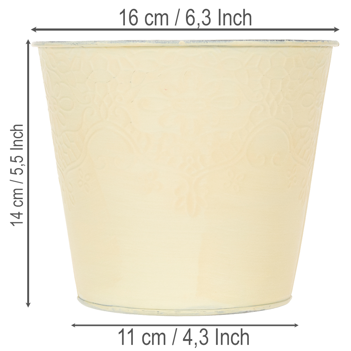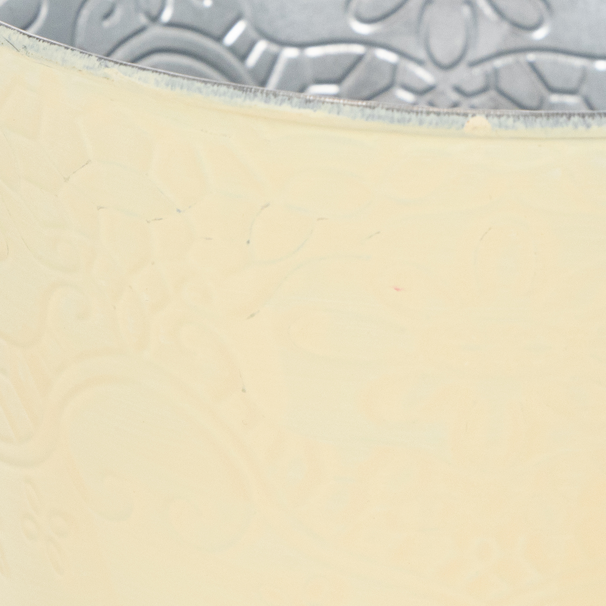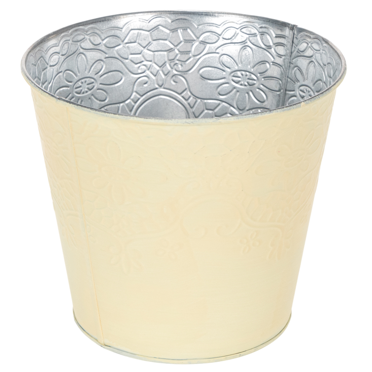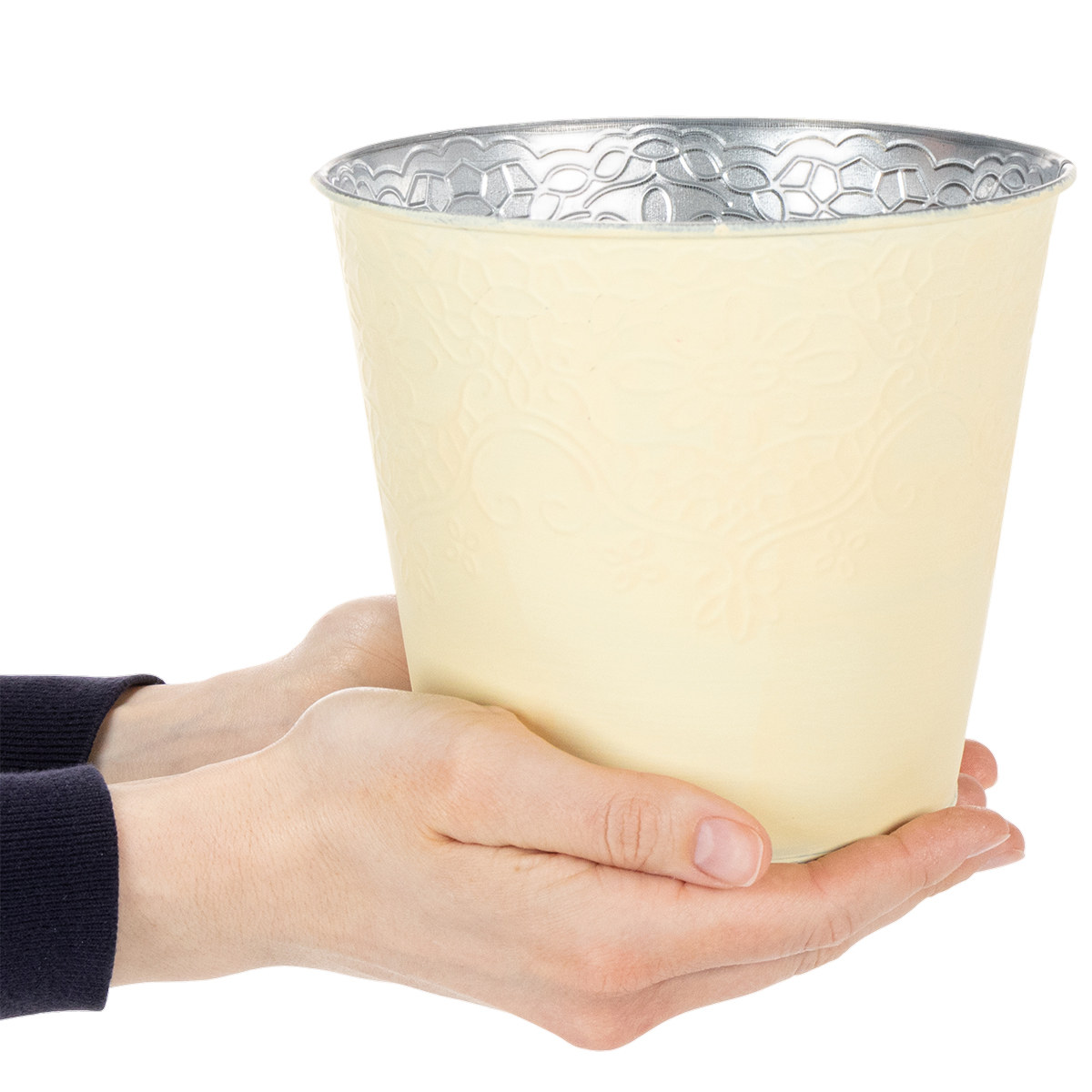 A kiváló minőségű fémdekorációt dombornyomott, retró sikkes virágminta díszíti, kívül élénksárgára festve, látható ecsetvonásokkal. A virágcserép virágai és indái arra emlékeztetnek