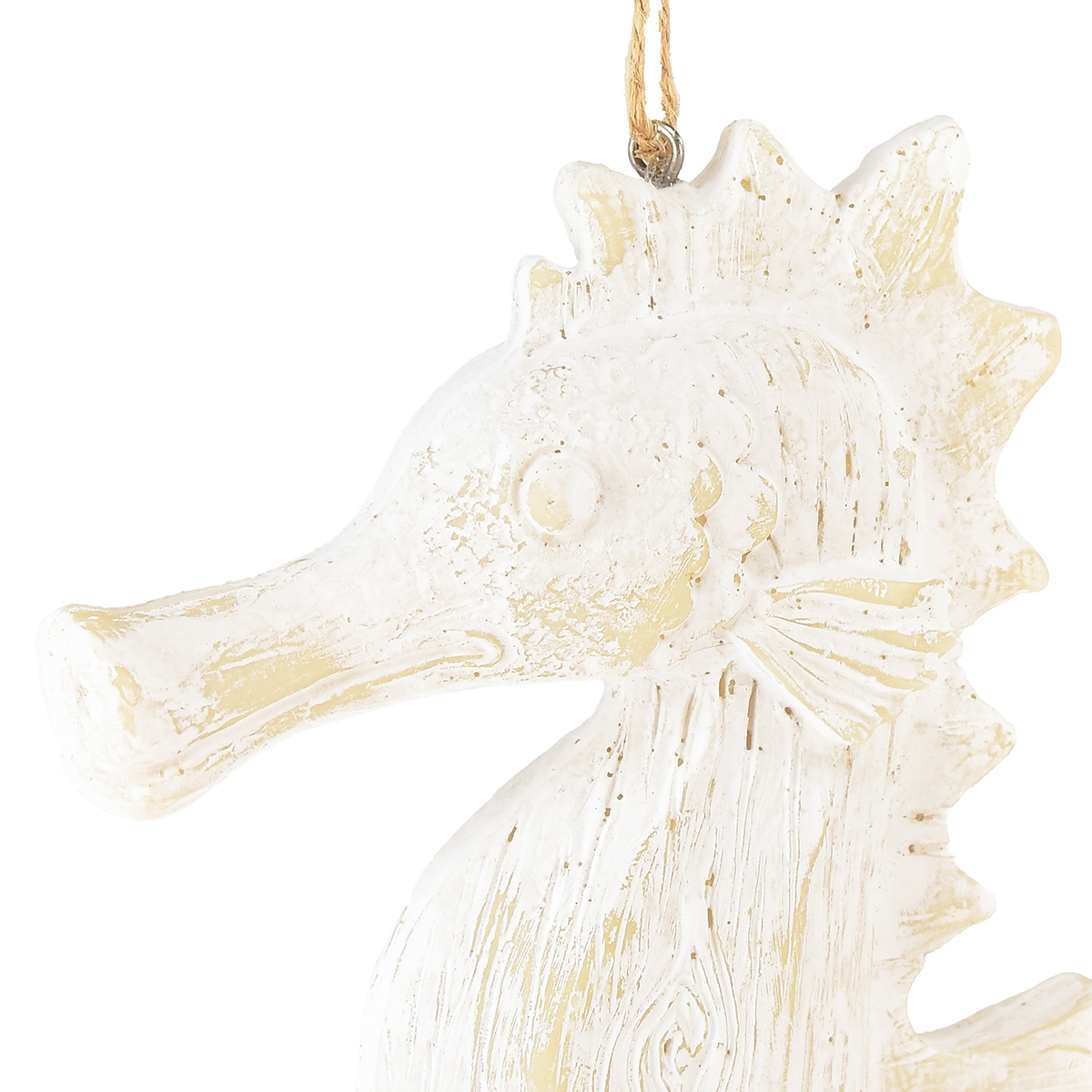 A csinos csikóhal függő dekoráció úgy néz ki, mintha fából faragták volna, de műanyagból készült, és divatos, kopott stílusban készült.