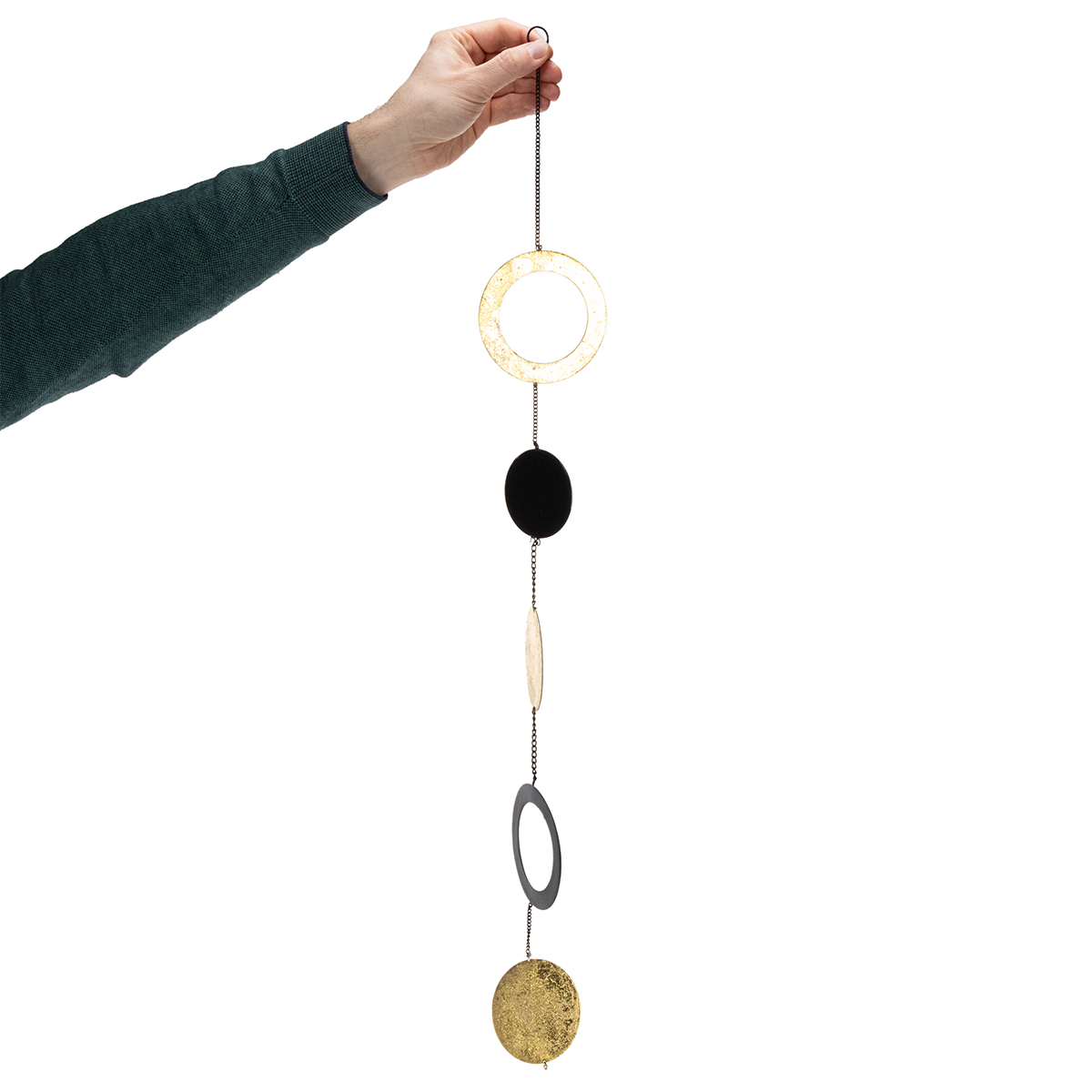 Ez a dekoráció öt különböző méretű, kerek elemből áll, melyek korongok és gyűrűk formájában jelennek meg, fekete és arany színben váltakozva. A kör alakú függő dekorációkat vékony fémláncok kötik össze, és mindegyik tetején egy kis gyűrű található az akasztáshoz.