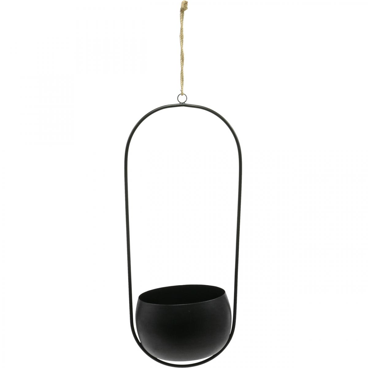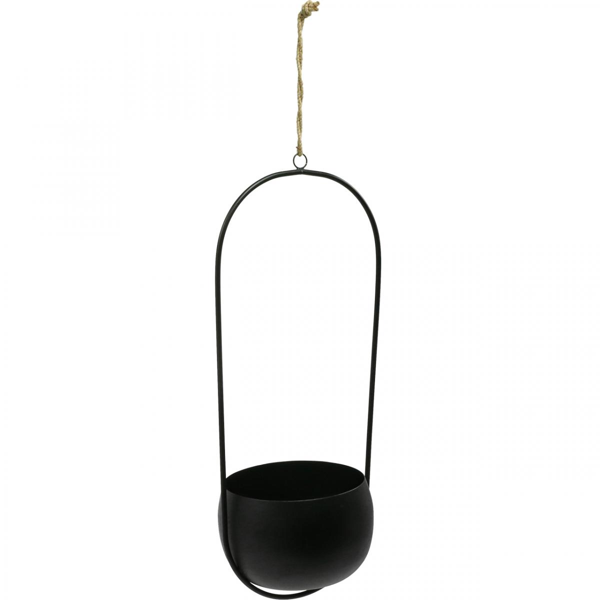 A fekete cinkedényhez egy hosszúkás hurok csatlakozik, melynek felső végén fűzőlyuk van. A felakasztott kosár természetes szálú zsinórral akasztható a fűzőlyukra. Ez már a lyukban van.