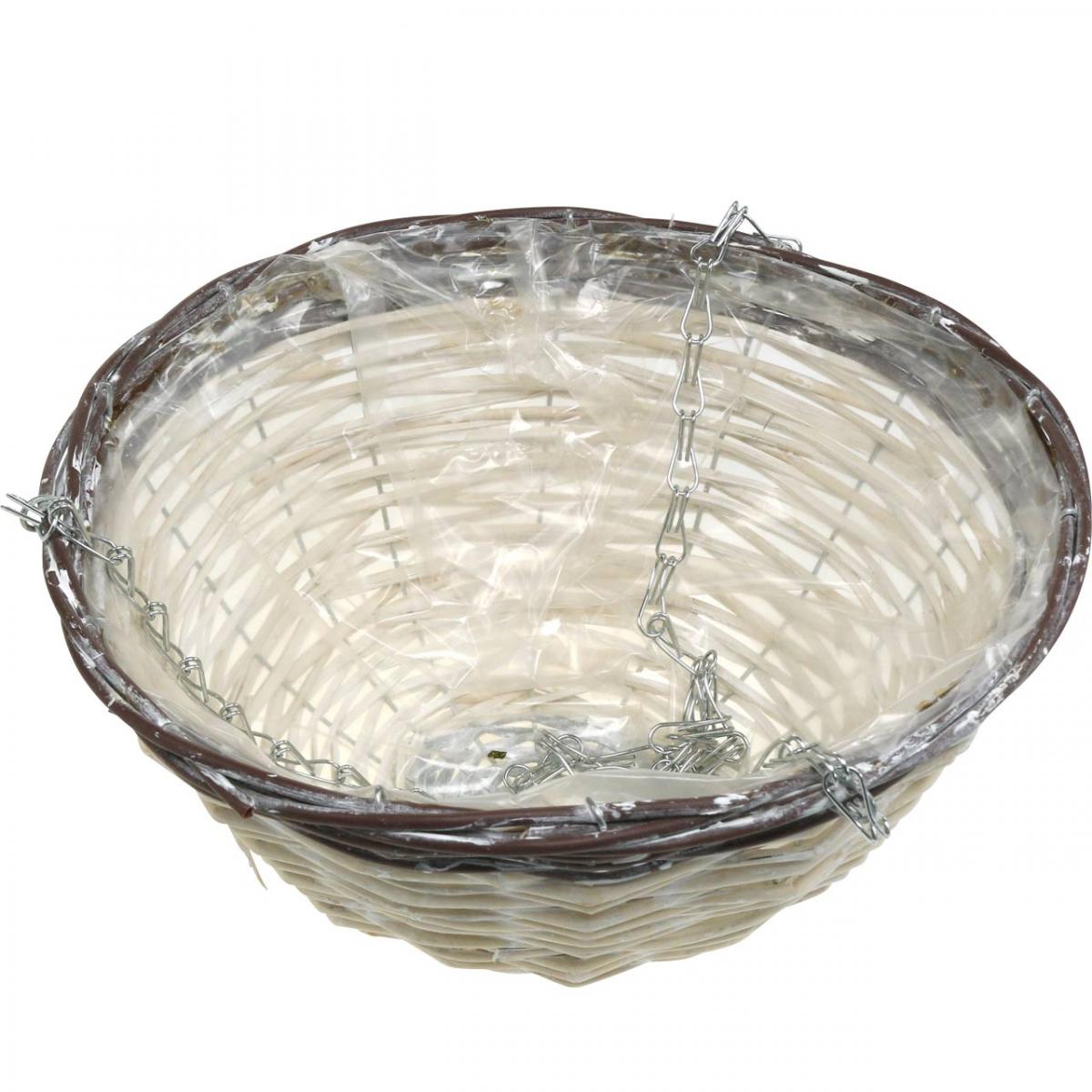 A barna és fehér színű chipkosár divatos, kopott, elegáns fehérben lett mosva, és praktikus felfüggesztéssel rendelkezik, amely három fémláncból áll, amelyek tetején egy erős kampó záródik.