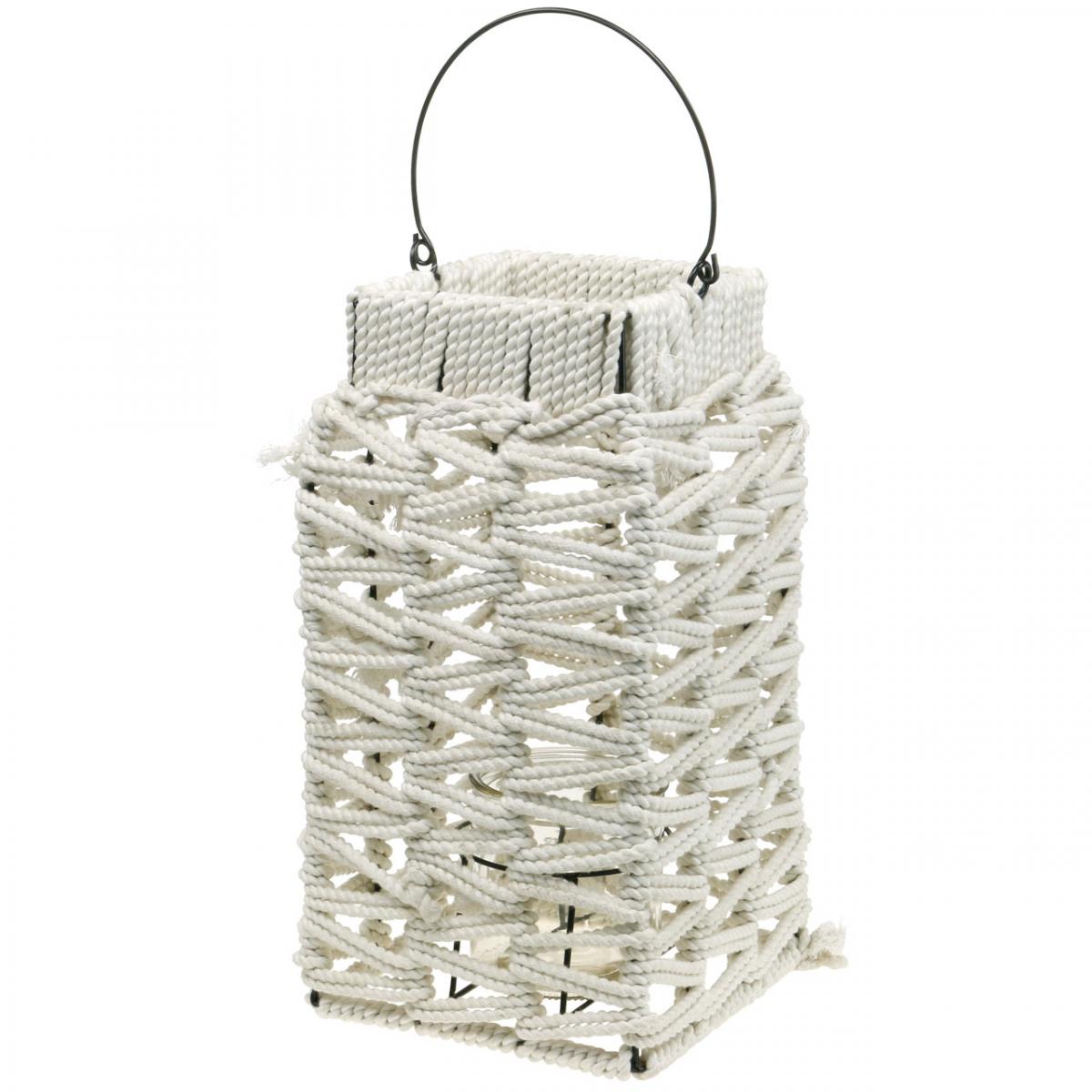 A fonott lámpás fekete fém kerettel rendelkezik, oldalfalonként négy függőleges támasztékkal. A vastag pamutzsinórokat körös-körül művészien szőtték a szögletes lámpás fémrudai közé, így tetszetős halszálkaszerű mintázat látható. A lámpa alján fonott mintával fém tartó található a gyertyaüveghez. Az átlátszó fogadalmi pohárba teamécsesek vagy oszlopgyertyák helyezhetők. Amikor a gyertya ég, a meleg fehér gyertyafény különösen lágynak tűnik a makramé szövésnek köszönhetően.