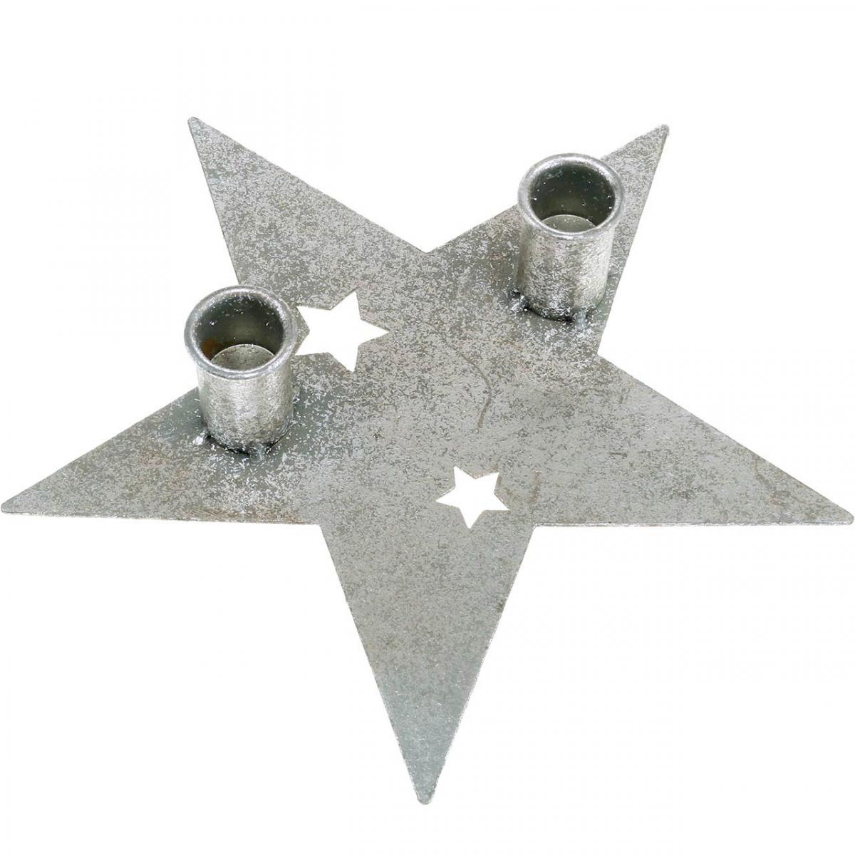Termék neve: Gyertya díszítő csillag, fém díszítés, gyertyatartó 2 kúpos gyertyához ezüst, antik megjelenés 23cm × 22cm