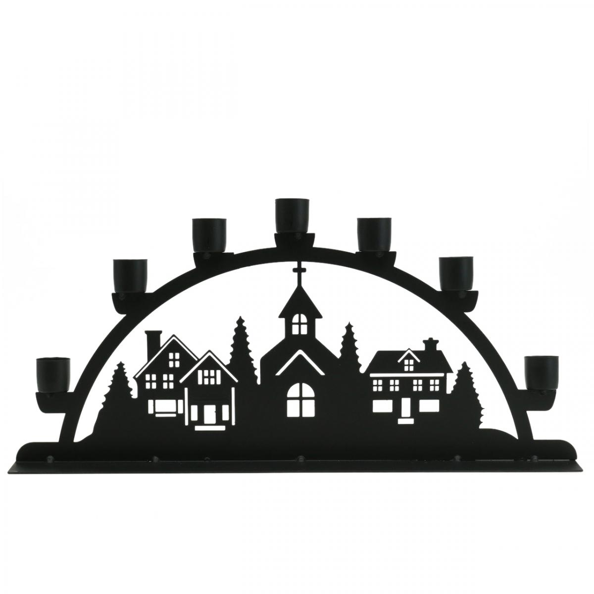 A népszerű karácsonyi dekoráció festői ábrázolások sziluettjét mutatja, amelyek különösen lenyűgözőek a gyertyák fényében. Ez a modern kialakítású fém gyertyaív feketére van festve, és egy keresztény templom épületét körülvevő házak és fák díszleteit mutatja be. A fém finoman kidolgozott bemélyedései olyan finom részleteket mutatnak be, mint az ablakok, ajtók és tetők. A falu életre kel, ahogy a gyertyák pislákolnak.