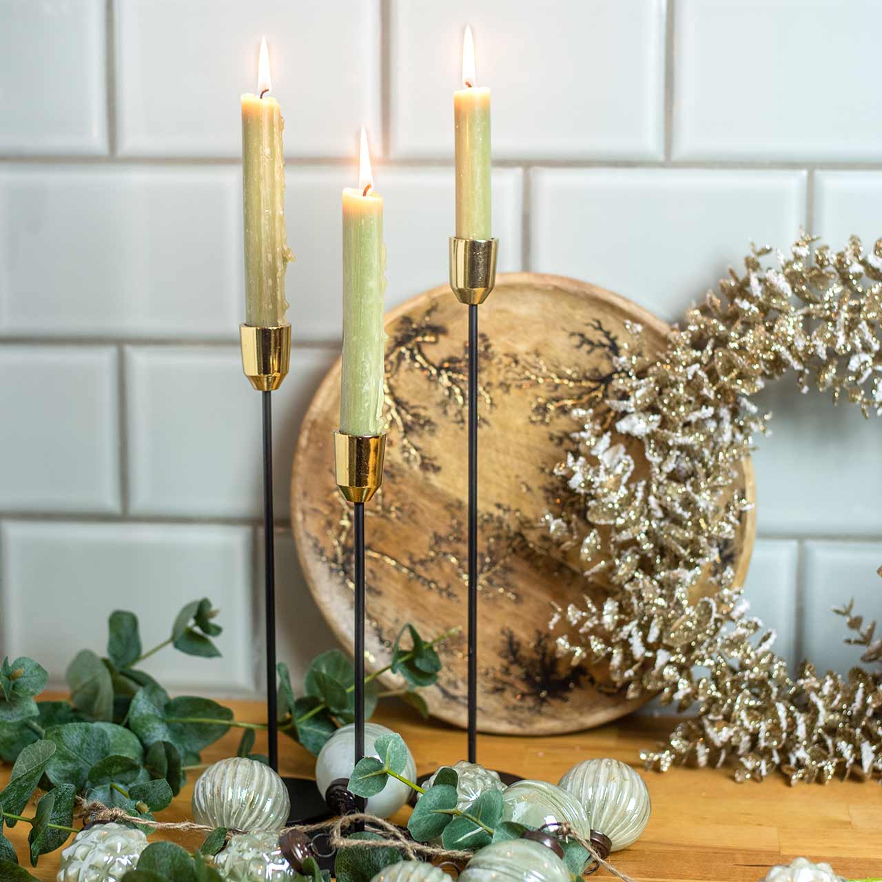 Az arany és fekete színű gyertyatartó tökéletes asztaldísz a legkülönfélébb lakberendezési stílusokhoz. Akár ünnepi alkalmakra, akár fémdíszként a hétköznapokba, a szép, fémből készült gyertyadekorációval mindig kéznél van a megfelelő gyertyatartó. A fém gyertyatartót felállíthatja egyenként, vagy kombinálhatja a sorozat több azonos vagy különböző méretű gyertyatartójával. A fém gyertyatartó 2,2 centiméter körüli átmérőjű kúpos vagy kúpos gyertyák tárolására alkalmas.