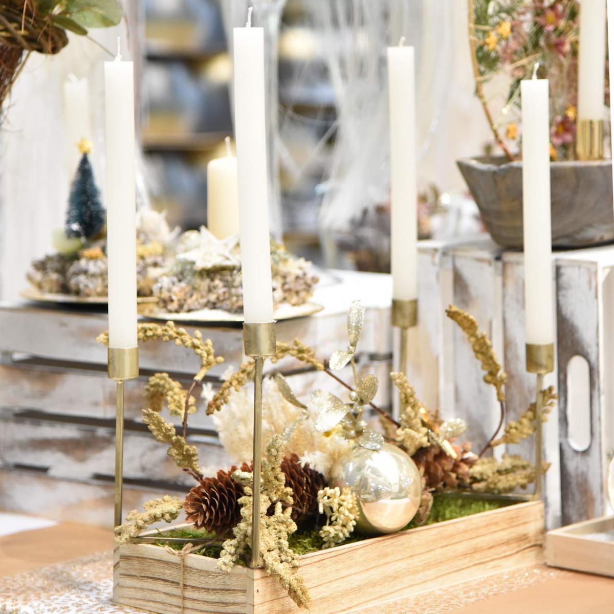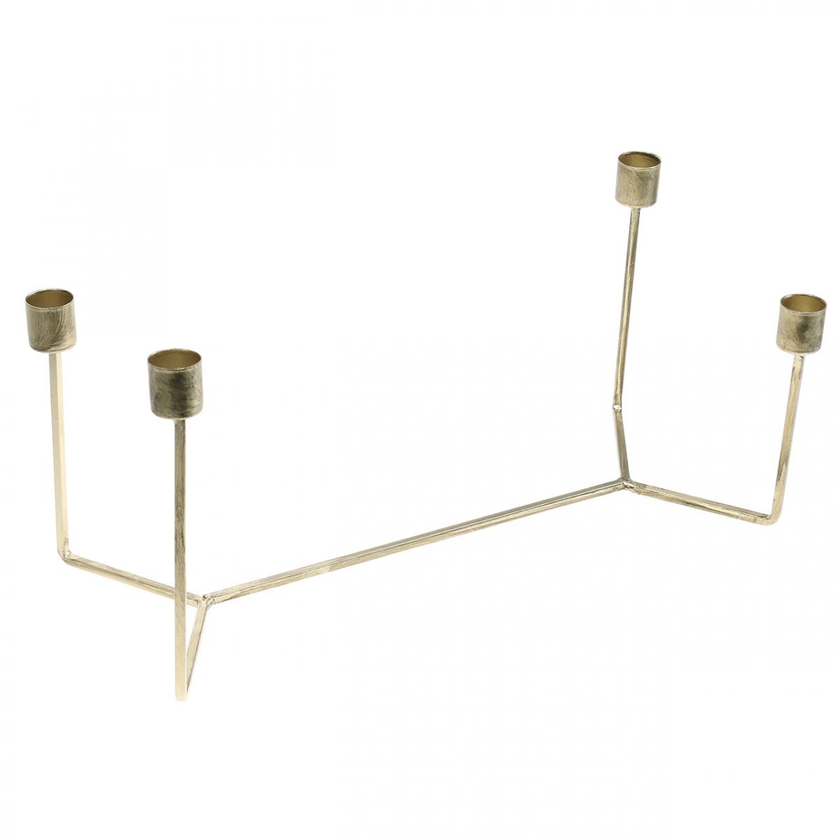 A világos, matt arany tónusú adventi gyertyatartó téglalap alakú tálcára egyszerűen felhelyezhető. Helyezzen virágkötést, mohát, dekorhomokot vagy kúpokat és diót a gyertyatartó szerkezetére. Úgy tűnik, hogy az egyes gyertyatartók kinőnek a díszítésből. Kérjük, vegye figyelembe, hogy az alap legyen érzéketlen és nem gyúlékony, a forró viasz lecsepeghet. Ha biztonságban szeretnél lenni, a gyertyatartó mécsesére LED valódi viasz gyertyákat tehetsz.