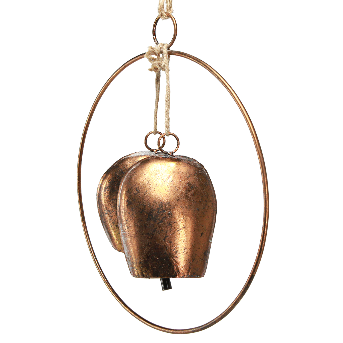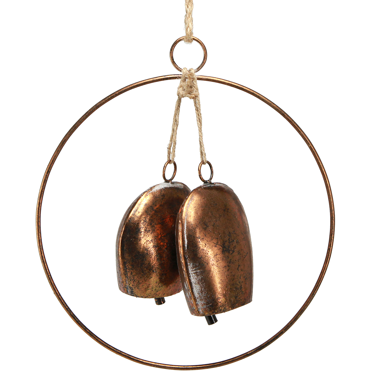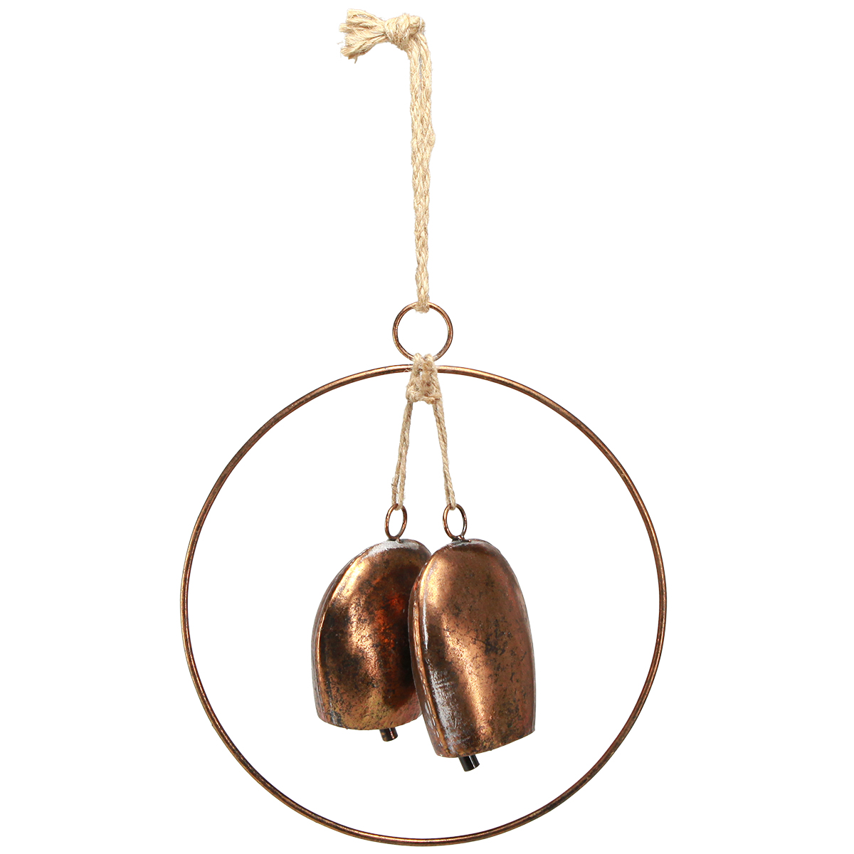 Ezek a bronz karácsonyi dekorációs harangok tökéletesen illeszkednek egy hangulatos és klasszikus karácsonyi dekorációba. A fém díszgyűrű két különböző méretű, hagyományos bronz kivitelű tehénharangot tart, melyeket elegánsan juta zsinórokkal rögzítenek. A kereplőkkel kiegészített tehénharangok mozgatva igazi ónos hangot adnak ki.