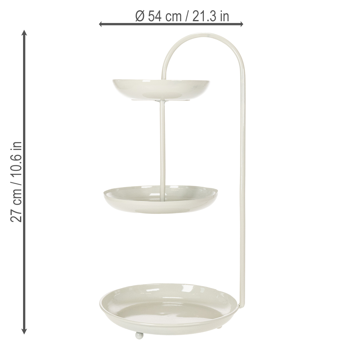 Letisztult, modern megjelenésével ez a háromszintes tálalóállvány bármilyen szobába illik, és különleges hangulatot kölcsönöz a dekorációnak. A három szint különböző átmérőjű (26 cm, 23 cm és 18 cm), és helyet kínál csomagolt élelmiszereknek vagy díszítőelemeknek. A semleges színséma megkönnyíti más dekorációs stílusokkal való kombinálást – legyen az minimalista, skandináv vagy akár bohém. Az állvány praktikus is: könnyen tisztítható, helytakarékos és masszív. Tökéletes a nappali asztalán, esküvői asztal központi díszeként vagy tematikus partikra! Megjegyzés: nem alkalmas csomagolatlan élelmiszerek tárolására, így ideális csokoládékhoz, formázott cupcake-ekhez vagy dekoratív figurákhoz. Kombináld az állványt más Floristik24 termékekkel, például egy stílusos asztali lámpával vagy hozzá illő virágvázákkal, hogy tökéletesen kiegészítsd a hangulatot!