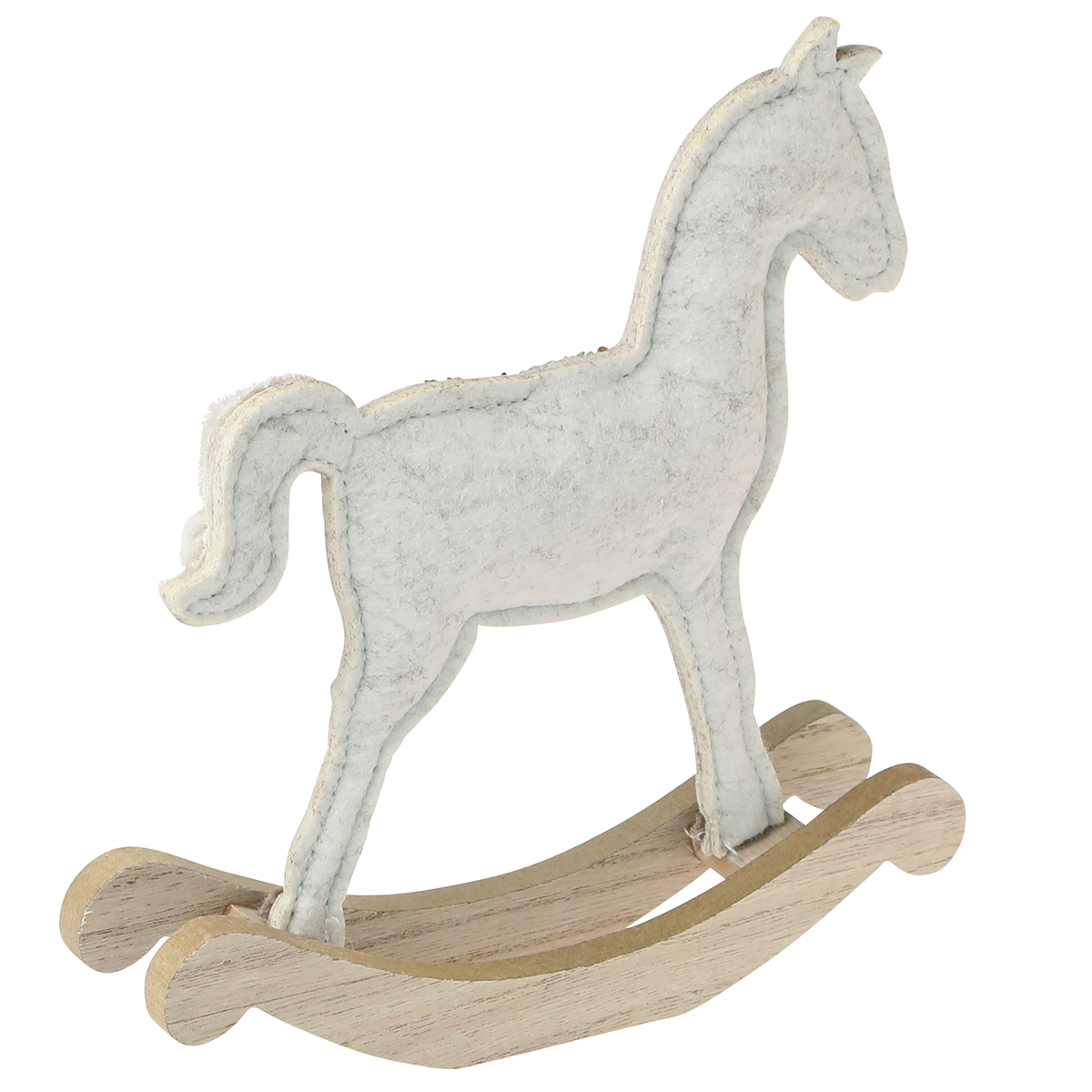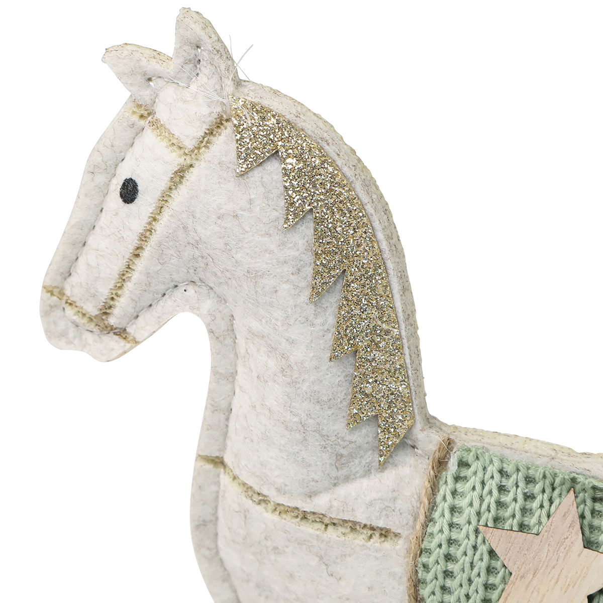 Ez a dekoratív hintaló krémszínű filcből arany kötőfékkel és zöld, csillagos nyereggel nosztalgikus akcentussal fűzi karácsonyi díszeit. A filc dekoráció egyik oldalán díszített, és biztonságosan áll a fa futószalagokon. A futók egy lapított területtel rendelkeznek a biztonságos elhelyezés érdekében. Az arany sörény ünnepi fényt kölcsönöz a hintalónak, míg a bolyhos fehér szálakkal díszített farok, a csillaggal díszített zöld nyereg és a fekete szemek kedves részletek.