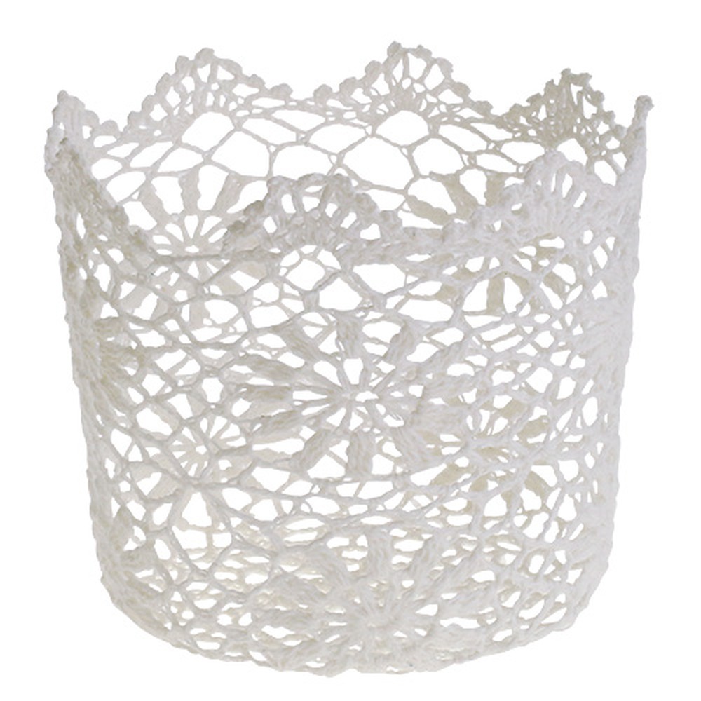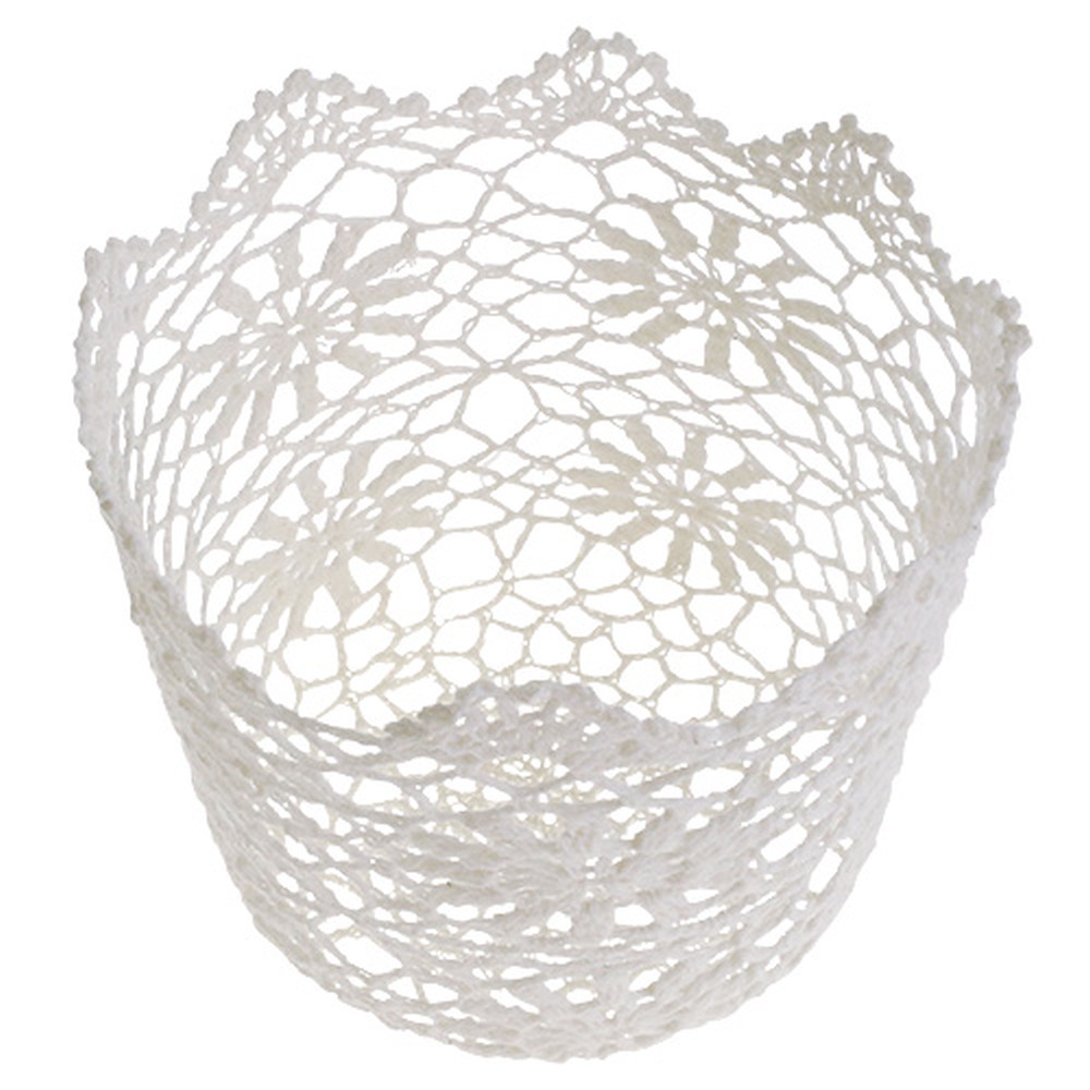 A fehér horgolt edény körülbelül 15 centiméter magas. Az átmérő a nyílásnál itt 17 centiméter, míg a lábnyom átmérője 14 centiméter körül mozog.