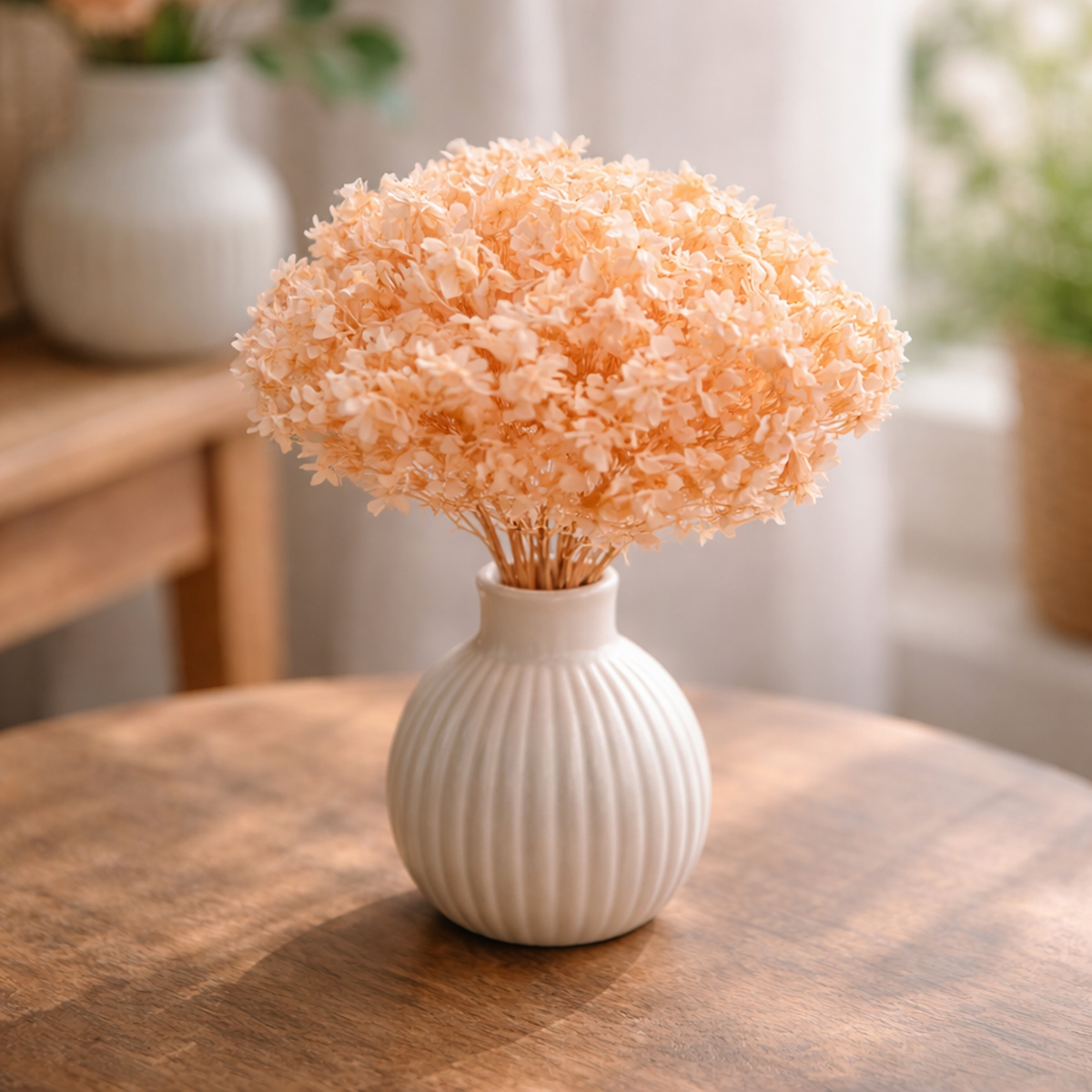 Szárított hortenziánk tökéletesen illik bármilyen környezetbe, legyen az modern, skandináv vagy romantikus vidéki stílus. A nagy, világos narancssárga hortenzia virágok lágy, meleg hangulatot kölcsönöznek dekorációjának, és biztosan vonzzák a tekintetet. Helyezze a csokrot egy egyszerű vázába, hogy kiemelje természetes szépségét, vagy kombinálja más szárított virágokkal egy pazarabb kompozícióért. Különösen alkalmas nappali és étkező dekorációjába, de esküvőkre és rendezvényekre is. Már egy is elég ahhoz, hogy egy szobát virágos eleganciával töltsön meg.