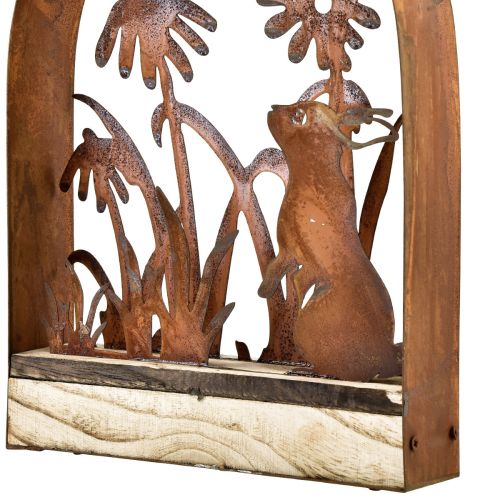 De nem csak a patina patinája teszi különlegessé ezt a nyuszi dekorációt. Ugyanis az aktuális trendet követve a fémből készült húsvéti díszek fa alappal érkeznek. 20 centiméter hosszú és 4 centiméter széles, békés forgatókönyvet mutat be egy nyúllal a réten.
