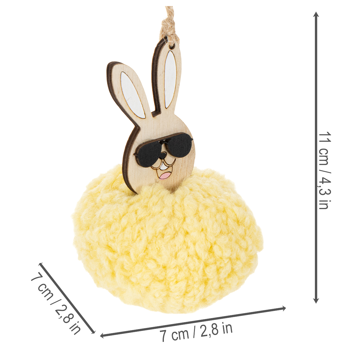 A dekoratív medálok a zsinórnak köszönhetően bárhová rögzíthetők. Az egyik nyuszifülre van rögzítve, így a vicces nyuszi dekoráció mindig kissé ferdén fog lógni. Egyszerűen szeret kilépni a sorból, olyan pimasz, amilyen.
