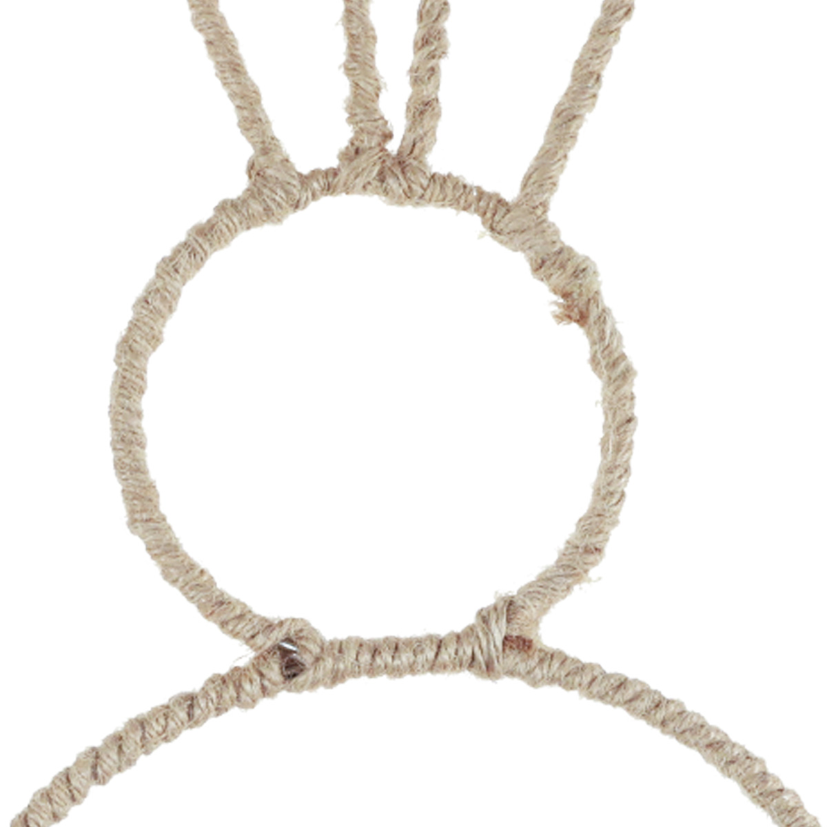 A húsvéti nyuszi dekoráció két egymás mellett fekvő hurokból készül. A kis hurok a fejet, a nagy a testet jelképezi. Természetesen a fülek sem hiányozhatnak. A drótfigura füle, mint az egész húsvéti nyuszié, természetes szálba van csomagolva.