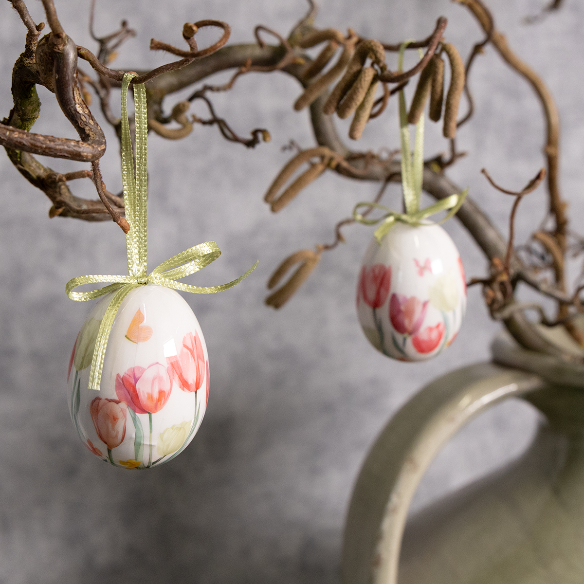 Miért szeretjük ennyire ezeket a tulipános dísztojásokat? Egyszerűen: természetes és visszafogott eleganciát sugároznak. A kézzel rajzolt tulipánmotívum tiszta tavaszi frissességet áraszt. Ezek a tojások strapabíró műanyagból készültek, így könnyűek, és lehetővé teszik, hogy bármilyen ágról biztonságosan felakaszthatók legyenek anélkül, hogy elnehezítenék azt. A zöld szaténszalag további színkontrasztot biztosít, amely fokozza a természetes hatást. 6 cm magasak és 4 cm átmérőjűek, így elég visszafogottak ahhoz, hogy harmonikusan illeszkedjenek bármilyen dekorációhoz, mégis elég szemet gyönyörködtetőek ahhoz, hogy kifejezzék a tekintetüket. Ez a készlet egy praktikus, 12 darabos kiszerelésben kapható – elég ahhoz, hogy stílusosan feldobja otthona különböző pontjait. Akár a húsvéti fa fénypontjaként, akár a tavaszi ablak díszítésére, akár ajándékszalagon egy különleges kiegészítőként, ezek a tojások bárhol remekül mutatnak.