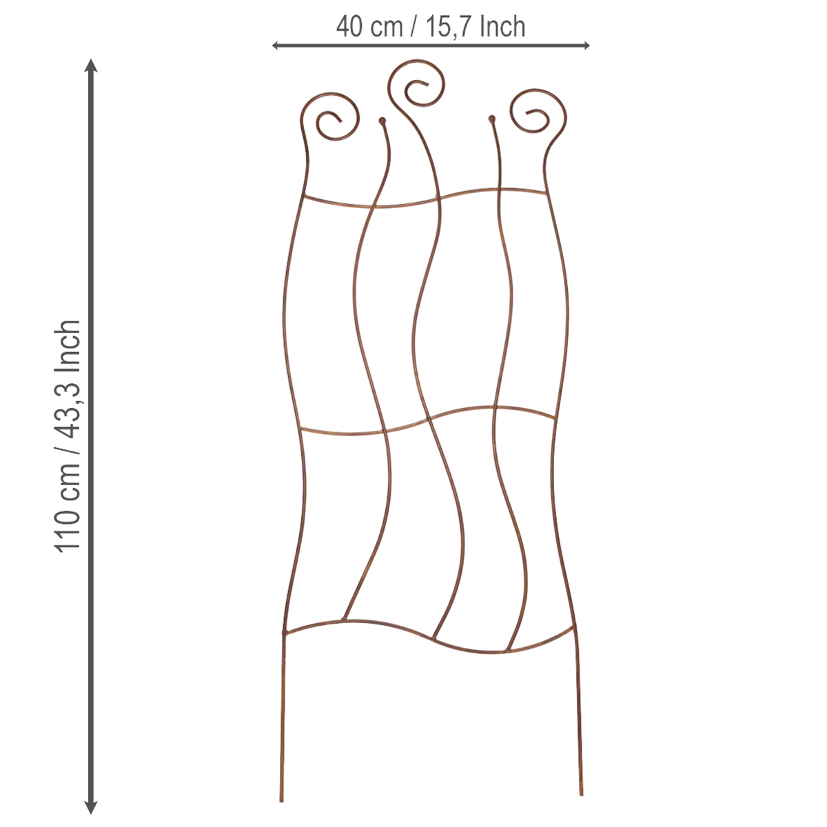 Ez a dekoratív fémrács csodálatos kiegészítője lehet bármely kertnek. Áramvonalas vonalai eleganciát kölcsönöznek neki, amely tökéletesen illeszkedik a természetes, romantikus vagy modern kerti tervekhez. Robusztus szerkezetének köszönhetően a rács nemcsak stabil tartást biztosít, hanem dekoratív elemként is szolgál – akár elválasztóként a kerti területek között, akár szemet gyönyörködtető elemként az ösvények és virágágyások mentén. Az időjárásálló acélpatina kifinomult megjelenést kölcsönöz, amely gyönyörűen harmonizál bármilyen környezettel. És ami a legjobb: a rács hihetetlenül könnyen tisztítható. Egy nedves ruhával eltávolíthatja a szennyeződéseket és az időjárás viszontagságait.