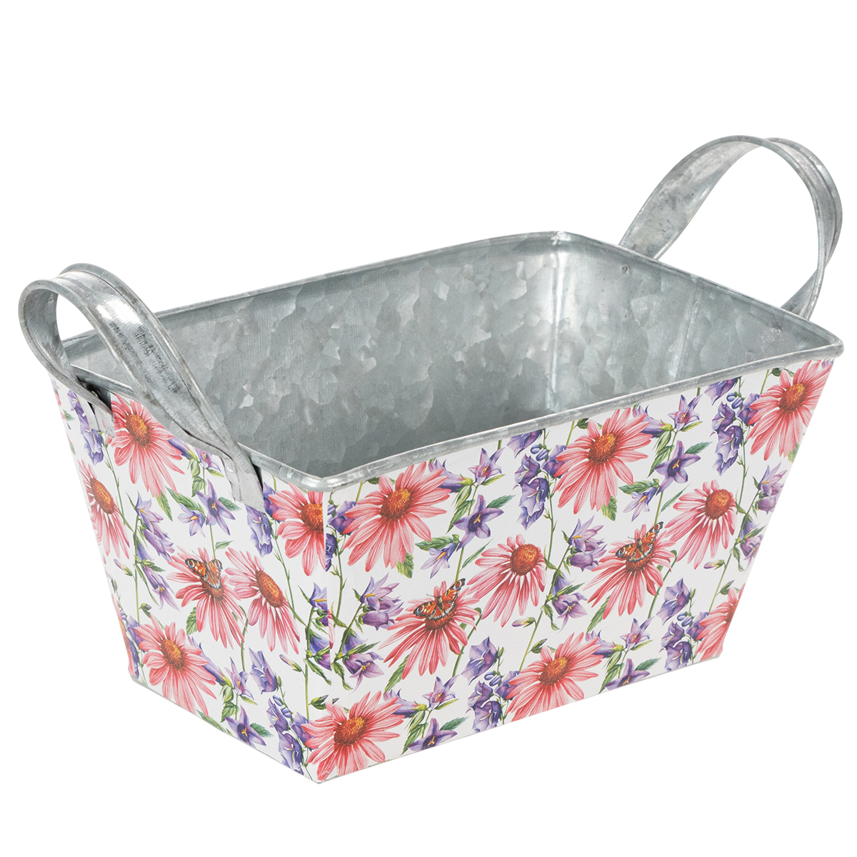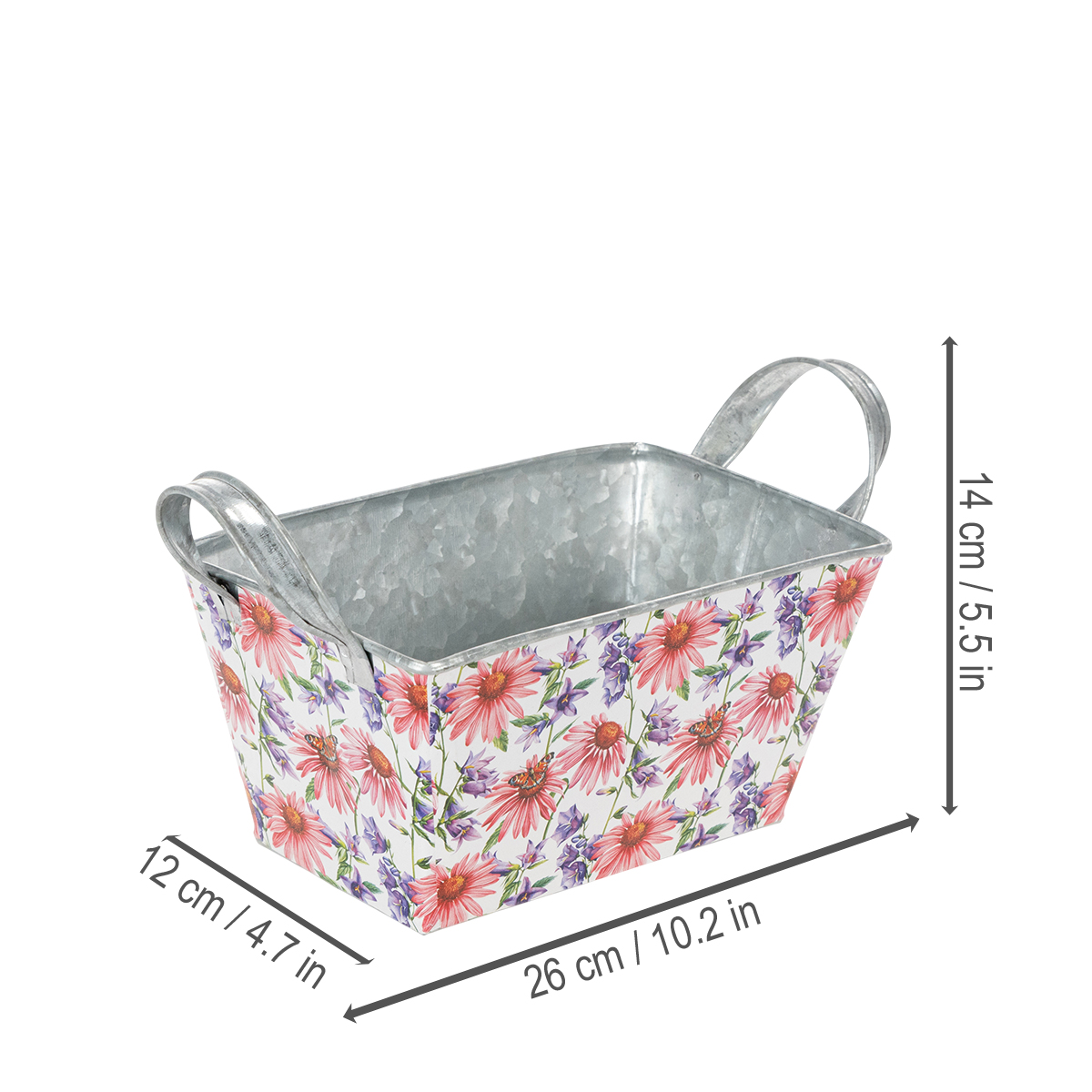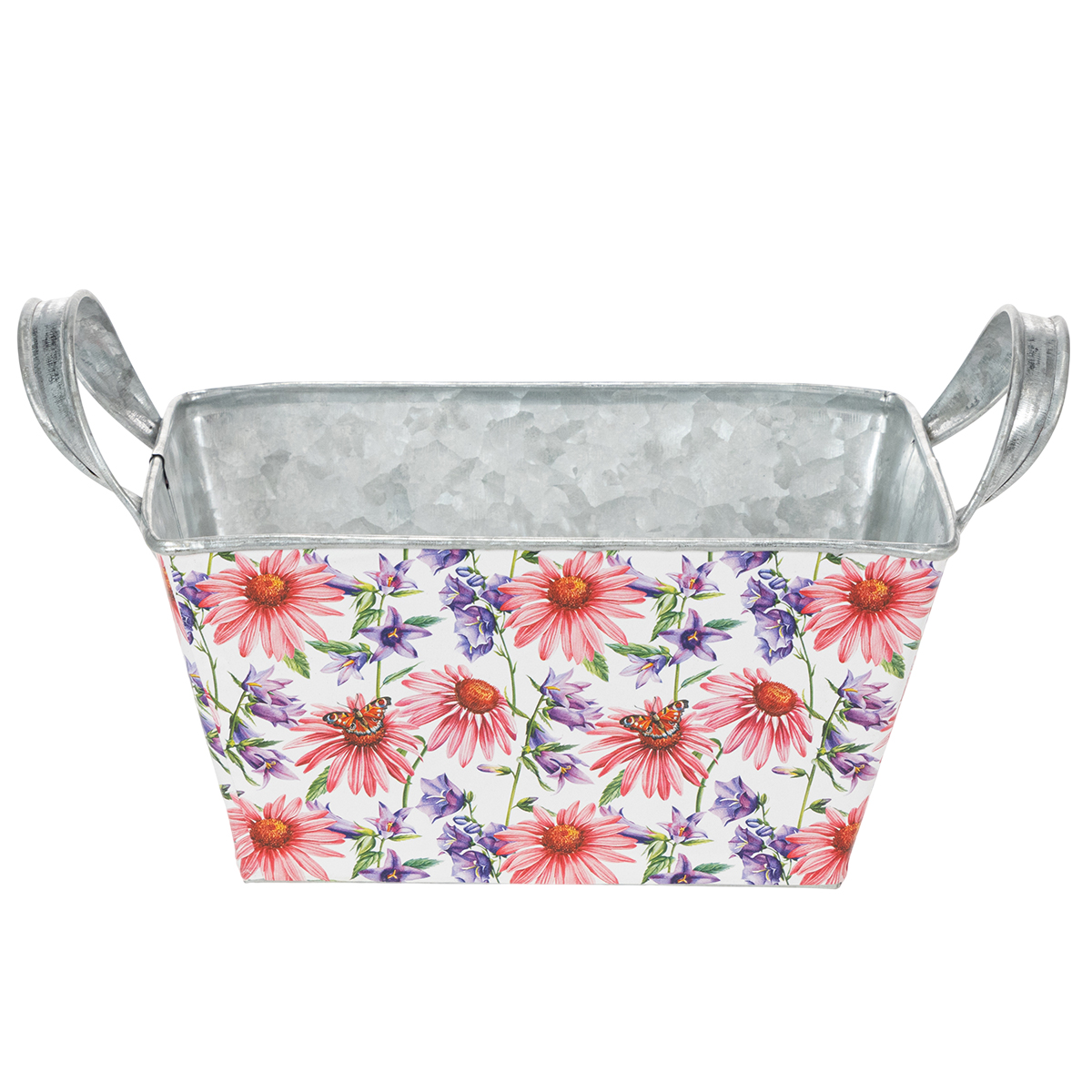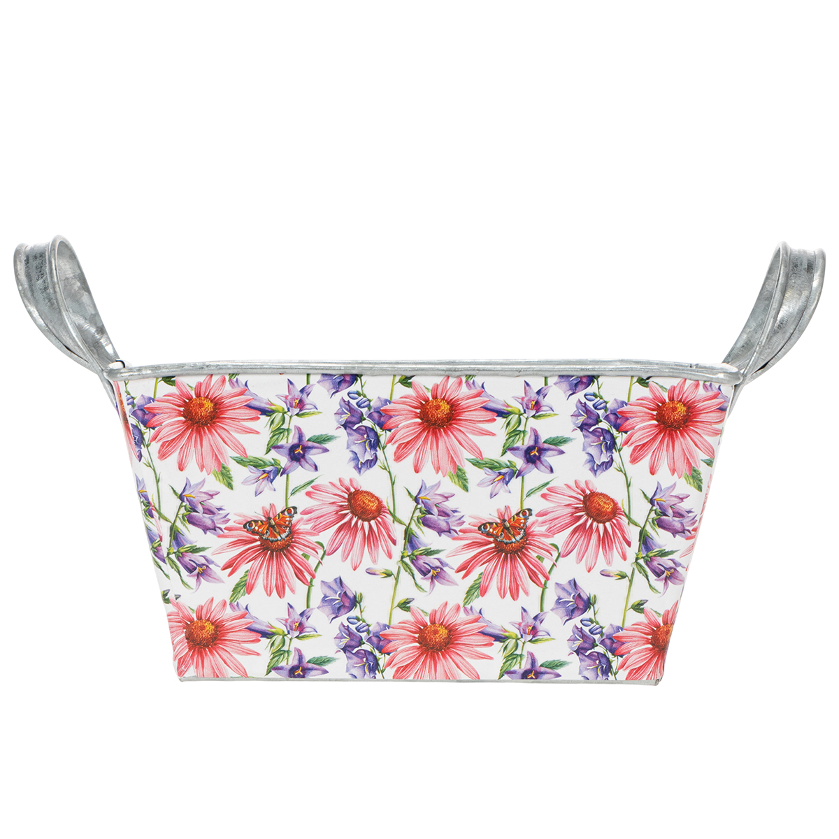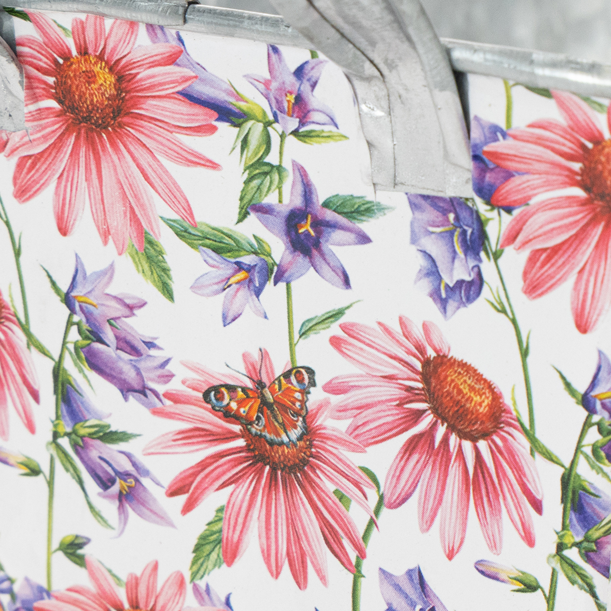 Rózsaszín és lila tavaszi virágok fehér alapon változatos és optimista keretet alkotnak. A virágmotívumot egy erős fóliára nyomtatták, ami viszont a cinkedényhez tapad. Így az ezüst színű cinkkel ellátott belső rész erős kontrasztot alkot a tavaszi dekorációban.