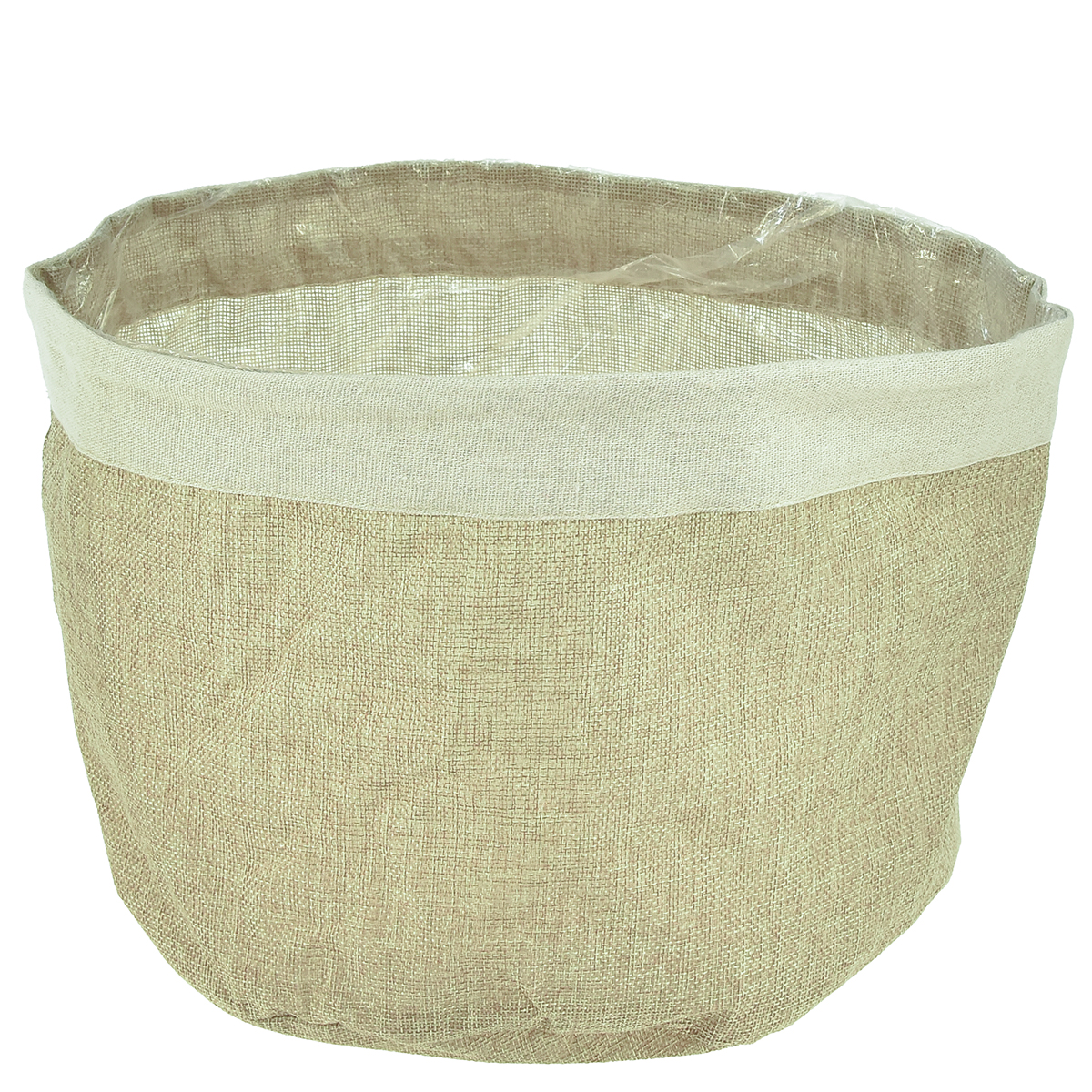 Széles hajtogatott szalag keretezi a jutaültető szélét. A szövetet műanyaggal finomították, és a szövetkosár nyílásába fóliát varrtak. A természetes színű edény olyan elegánsnak tűnik.