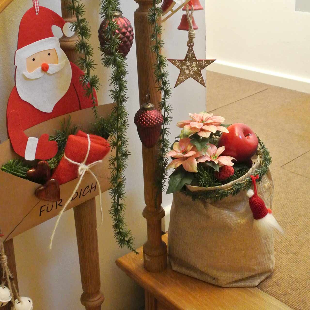 A karácsonyi dekorációban a jutazsák a Mikulás szánján van a kirakatban. Alma, dió és mandulamag díszgyümölcsként és színesen becsomagolt csomagok, majd kigurulnak a zsákból az áruk és ajánlatok között!