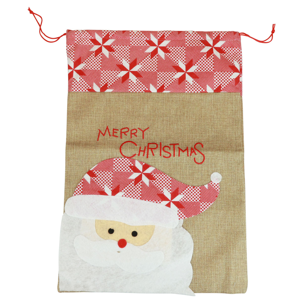 A jutatáska felül csillagdíszekkel nyomott filcszövettel van díszítve, elejére pedig egy szép filc Mikulás portréja van ragasztva. Piros betűkkel hímzett "Merry Christmas" szöveg és mindkét oldalán piros húzózsinór teszi teljessé a szép nagy jutazsákot.
