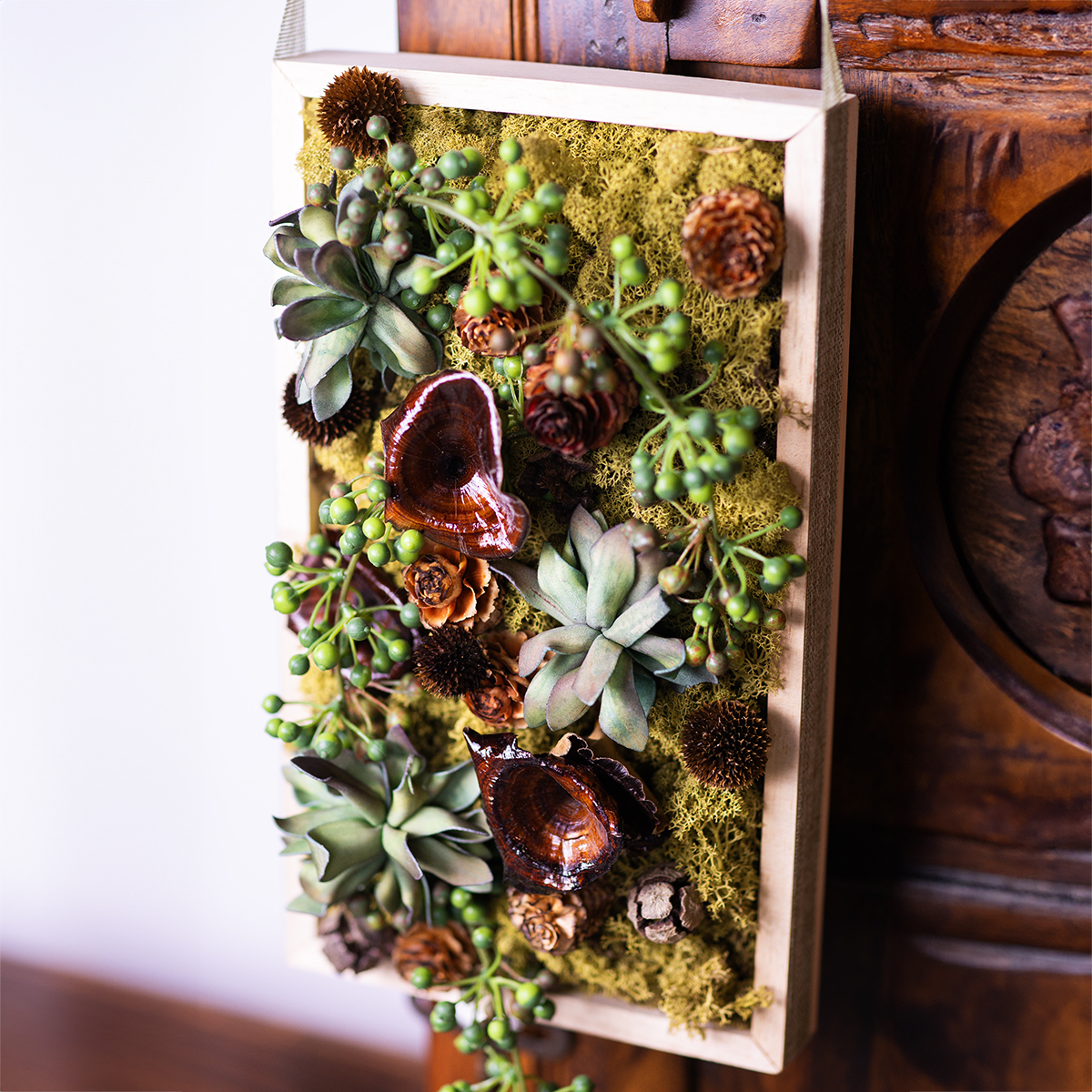 Anyagok: Természetes anyagok, például tobozok, fa, kéreg, moha, gallyak, levelek, szárított virágok, hínár és kókuszrost.