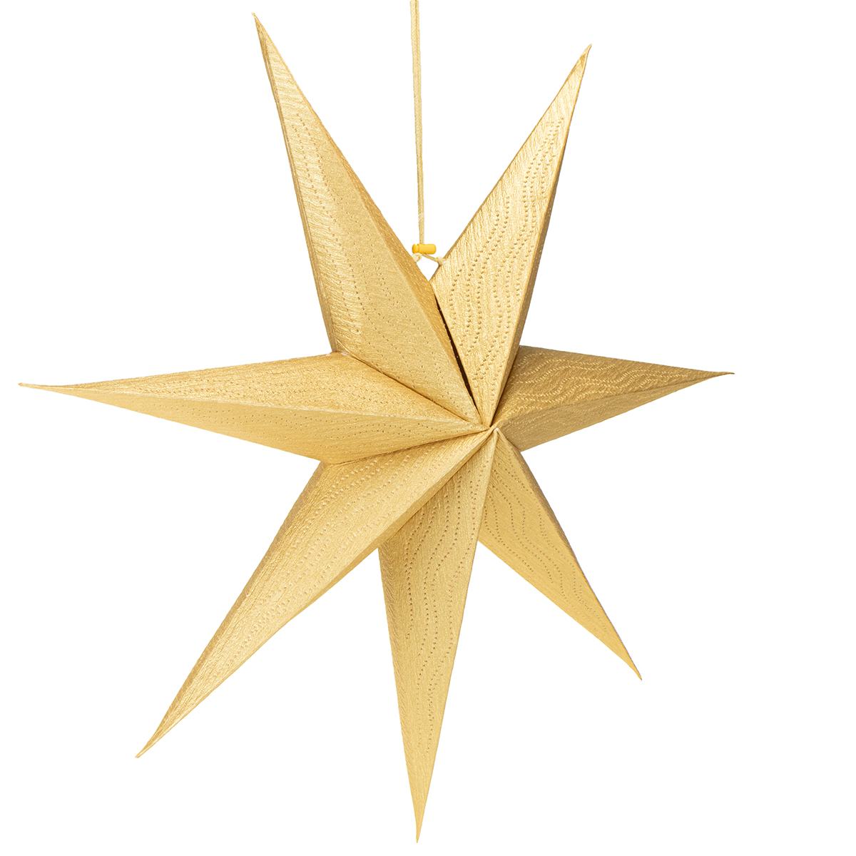 Ez a papírcsillag egyszerű, időtlen eleganciájával rabul ejti a tekintetet. Kiváló minőségű papírból finoman kidolgozva, meleg arany tónussal, zökkenőmentesen illeszkedik különféle dekorációkba. Az anyag természetes bájjal bír, miközben elég strapabíró ahhoz, hogy évről évre káprázatos fényeket biztosítson. 60 cm átmérőjével a csillag elég nagy ahhoz, hogy bármilyen környezetben feltűnő legyen.