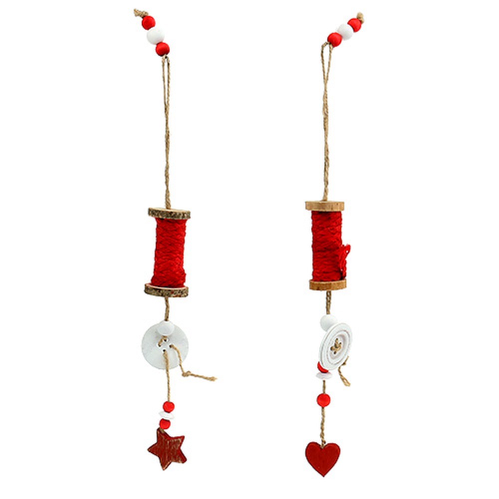 A piros színben akasztható karácsonyi díszként szolgáló cérnaorsó 4 darabos csomagban van, és körülbelül 39 centiméter hosszú. A natúr háncsból készült barna zsinóron egy fahenger található, mely kialakításában hasonlít egy cérnatekercshez, amelyre piros színű háncszsinór van feltekerve. Különböző méretű piros és fehér fagolyók is találhatók, a főzsinóron pedig fehér fagomb található. A készletből két dekoratív medál alján piros szív, míg a másik kettőnél piros csillag található.