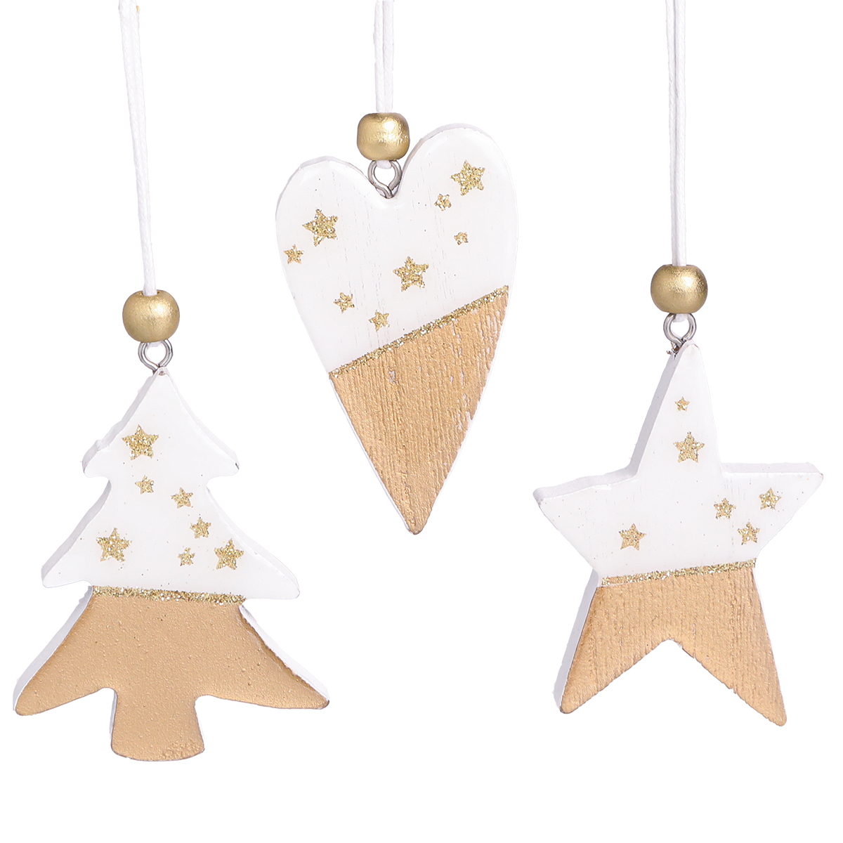 - Fából készült karácsonyi díszek, fehérre festve, arany díszítéssel