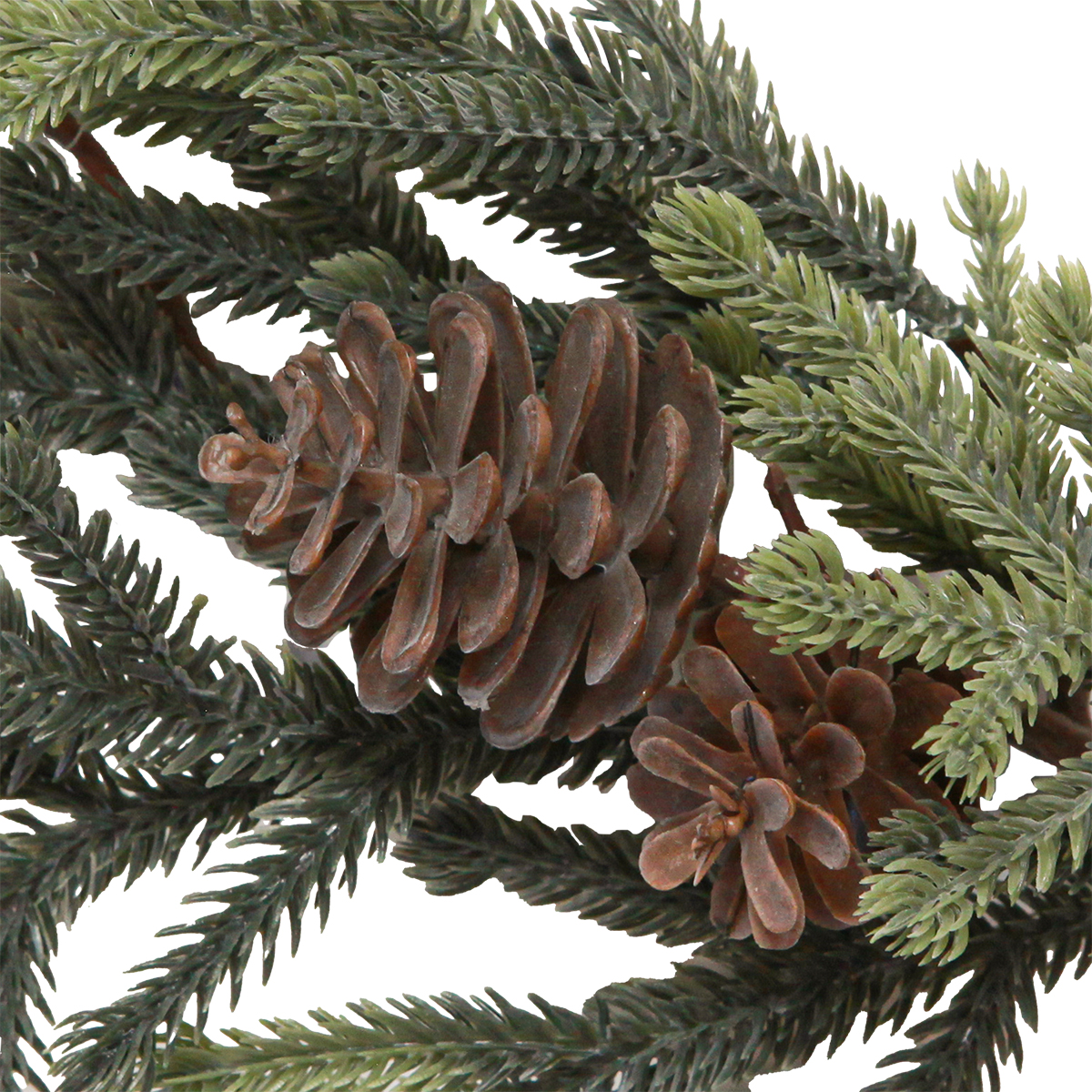 Karácsonyi fenyő girland, zöld és barna tobozokkal, 185 cm, díszítéssel
