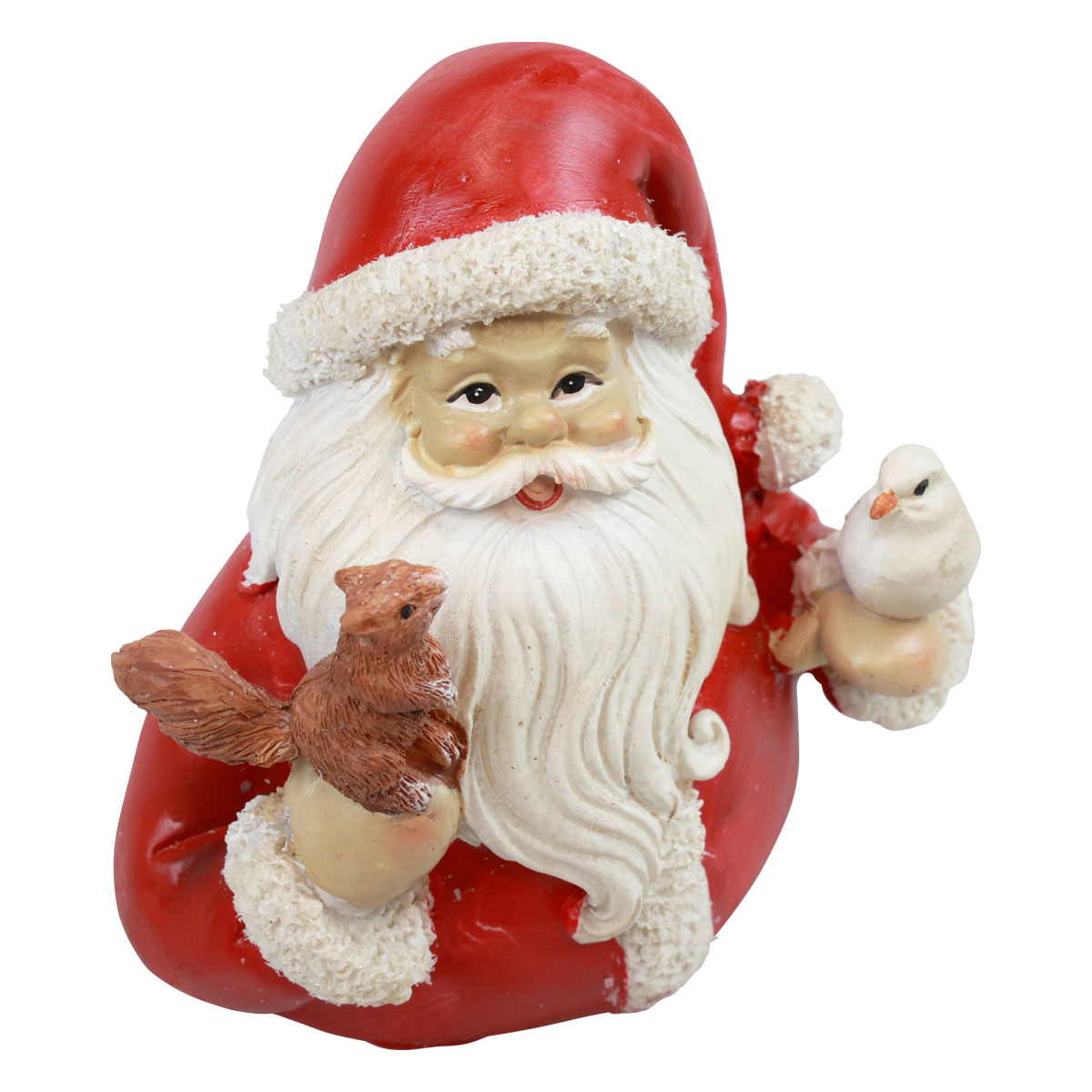 A durva fehér pomponos piros hegyes kalapot a két műkőből készült karácsonyi figura díszíti. A Mikulás mellszobra a gyönyörű kerek pocaknál ér véget, amit könnyedén elhelyezhetsz. A karácsonyi figura egyik kezén egy mókus, a másikon egy kis madár ül. A másik Mikulás figurát egy bagoly és egy második madár látogatja meg. A piros kalapon ül, fehér pomponnal.