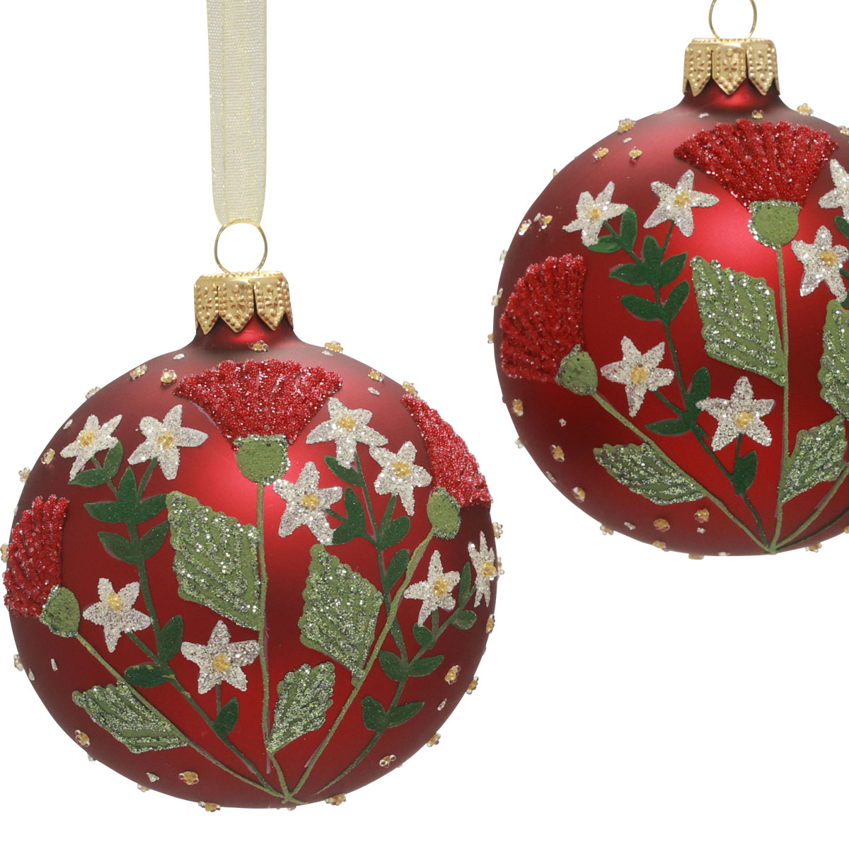 A vörös üveggolyókon a réti motívum csodálatosan harmonikus. Fehér, piros és zöld színben csillog. A csillag alakú virágok az edelweissre emlékeztetnek. Ezek uralják a képet, míg a csillogó vörös színű legyezővirágok és az ötletesen megtervezett levelek művészien illeszkednek az edelweiss motívumhoz.