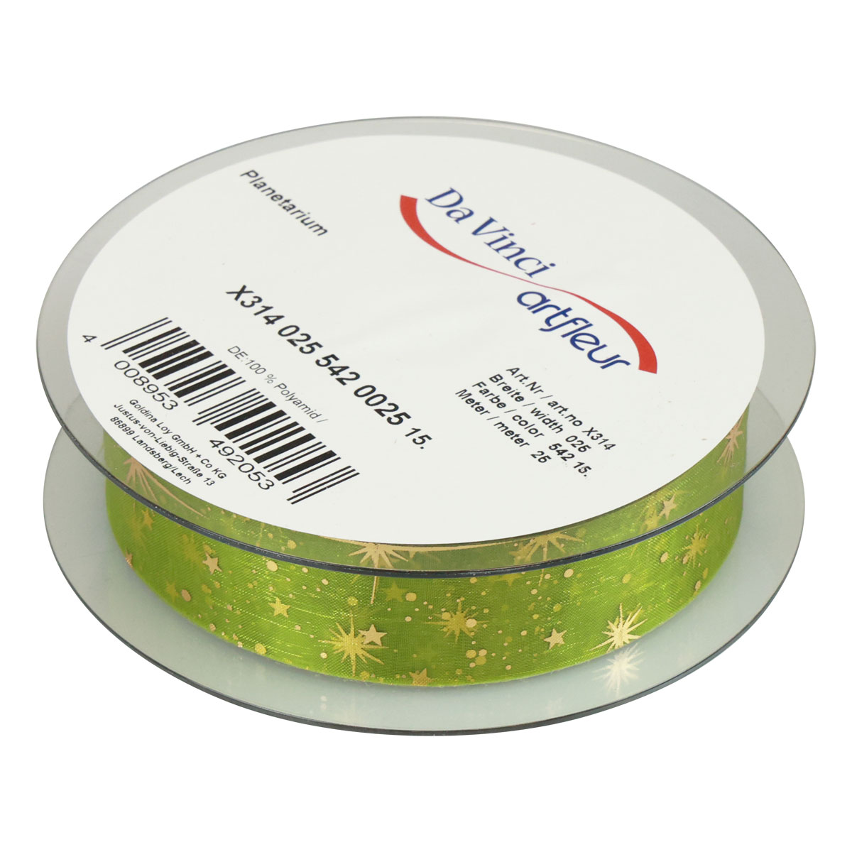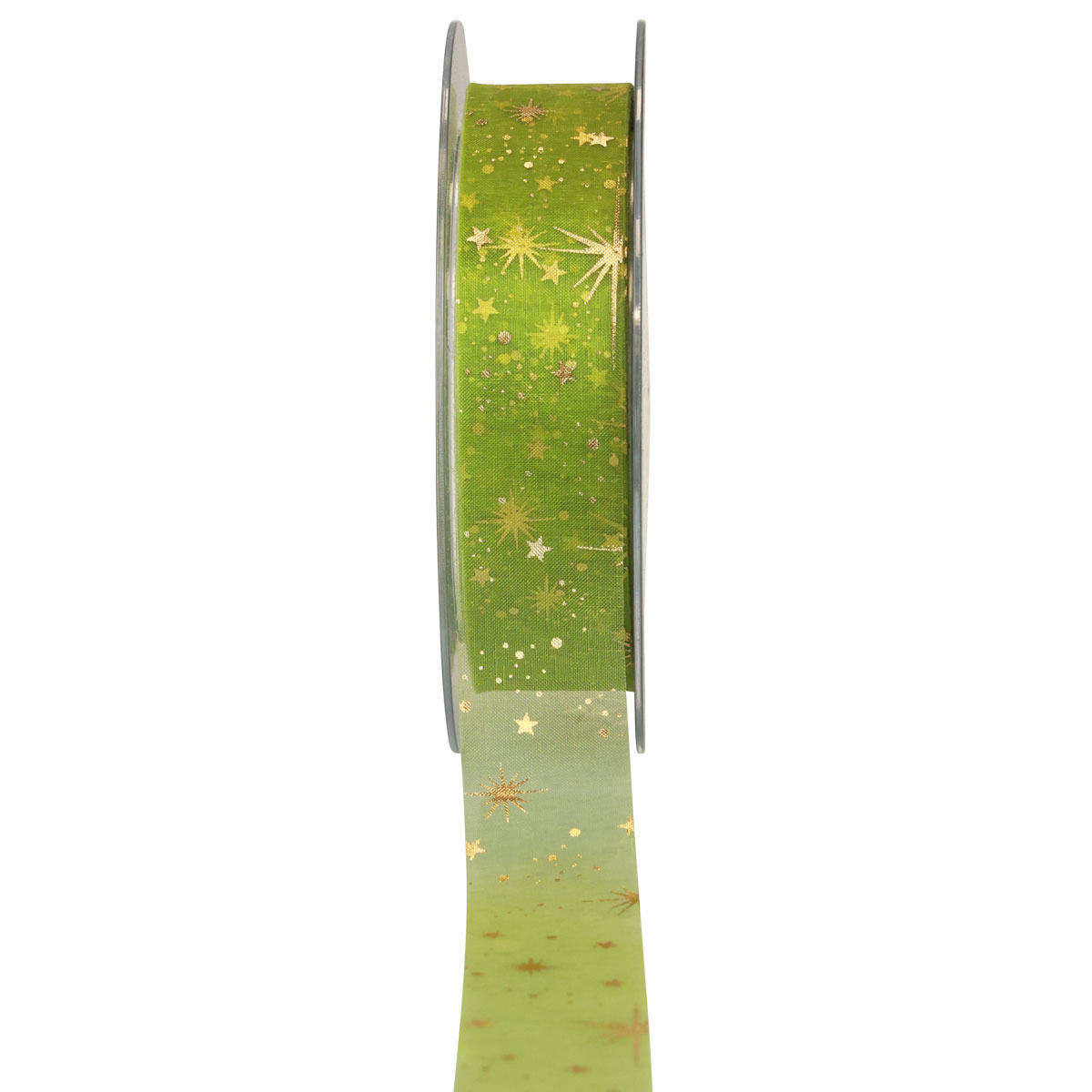 A zöld organza szalag egy enyhén átlátszó szalag és egy szabálytalan arany csillagminta összjátékával hat.
