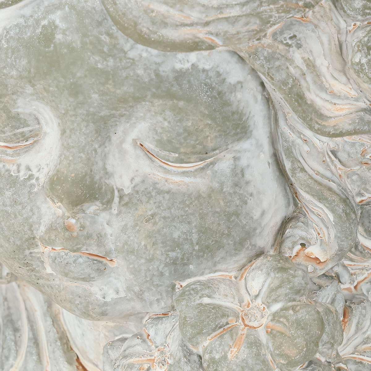 Nem megnyugtató gondolat, amikor egy angyal őrködik egy szeretett személy végső nyughelye felett? Ez az öntött kőből készült virágtartó angyal az angyalfigura kecsességét ötvözi egy virágtartó funkcionalitásával - ideális sírdíszként. A göndör hajú, csukott szemű angyal félalakja azonnal a béke és a belső nyugalom gondolatát idézi fel. Tökéletesen megrendezett, kékesszürke öntött kőből készült, stílusosan fehérre meszelt és arany díszítésű angyal méltóságteljes hangulatot kölcsönöz bármely nyughelynek. Képzelje el az angyalt, amint a színes virágok felett őrködik - egyszerűen gyönyörű kép, nem igaz? Az alján található négy habvédő biztosítja, hogy a figura biztonságosan álljon anélkül, hogy károsítaná a felületet.