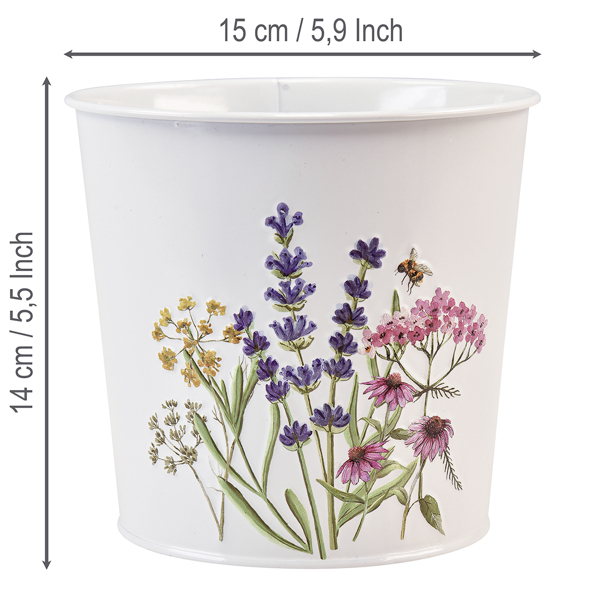 Virágzó kapor, levendula, oregánó, echinacea és méhek dombornyomása hívja a fém virágcserép elültetésére. De a díszek vagy egy cserepes növény is csodásan mutat a kerek cinkcserépben!