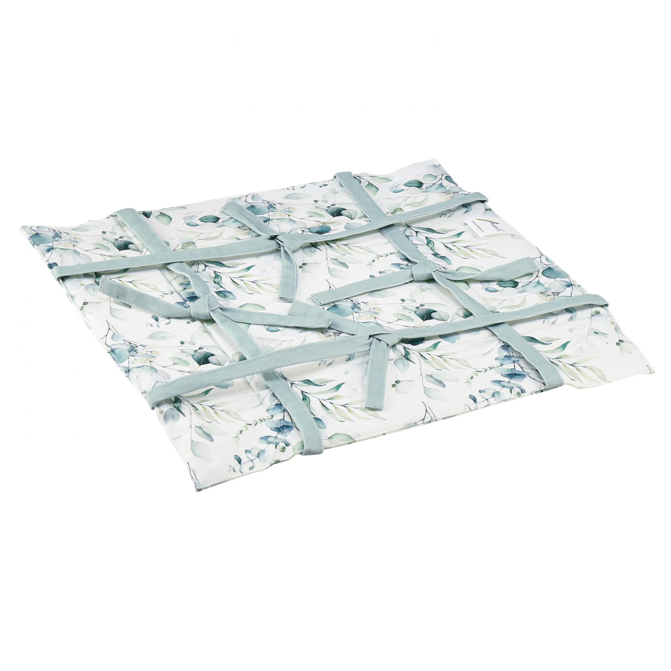 A kék és zöld színű eukaliptusz motívummal ellátott fehér szövetkosár edénysilóként is remekül használható. Egyszerűen állítsd össze, kösd össze a masnikkal – és kész is az új tál a kincsek számára!