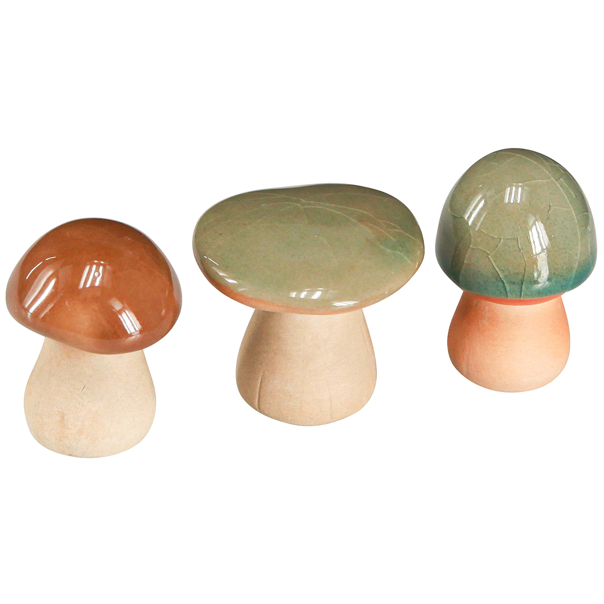A kerámia gombák 6 db-os készletben kaphatók, a kalapok átmérője 4-5 cm. Minden gomba egyedi, gondosan kidolgozott kerámiából, és színes, élénk mázzal van bevonva, amely finom repedésekkel rendelkezik – hasonlóan a kőedényhez. Ez rusztikus és természetes karaktert kölcsönöz a gombának, amely csodálatosan illeszkedik minden lakótérbe.