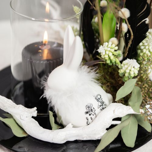 A fehér nyúldísz hegyezi a füleket és arc nélkül is úgy néznek ki a nyulak, mintha kíváncsian néznének előre. A nyúl kerek testét egyik oldalán fekete virágmintás díszíti - mint egy rét kivonata, tavaszra illően! A fehér, pihe-puha tollgallér még szebbé teszi a húsvéti dekorációt.