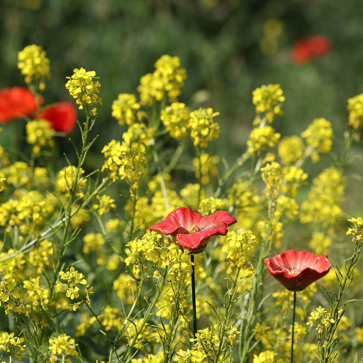 Azoknak, akik szeretnek dolgokat kombinálni, íme egy nagyszerű javaslat: Egészítsd ki ezeket a pipacsokat más kerámia elemekkel, például színes kerti figurákkal vagy egyszerű, földzöld vagy fehér árnyalatú karókkal. Ez harmonikus, mégis változatos összképet teremt.