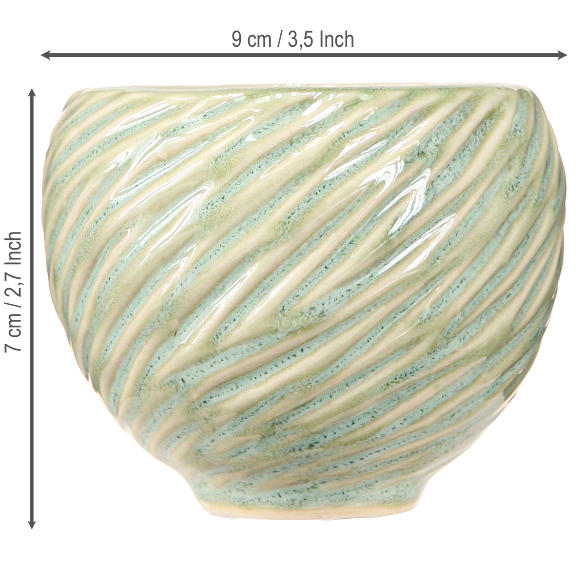 A spirális kialakítású, frissítő zöld színben pompázó kis kerámiatálak elegánsan ötvözik a stílust és a funkcionalitást. A körülbelül 9 cm átmérőjű és körülbelül 7 cm magasságú, kiváló minőségű kerámiából készült tálak gumós formát kínálnak, amely harmonikusan elvékonyodik az alap felé. A négy tálat vonzó spirális kialakítás jellemzi a zöld különböző árnyalataiban, finom kék árnyalattal gazdagítva, amely modern hatást kölcsönöz a tálaknak. A tálak tökéletesek az asztal díszítőelemeiként, és tökéletesen passzolnak virágkompozíciókhoz és kis növényekhez. Engedje szabadjára kreativitását, és használja a tálakat stílusos tárolási megoldásként ruhák és ékszerek tárolására. A zöld tónusok csodálatosan harmonizálnak a különféle otthoni kiegészítőkkel, és különösen jól kiegészítik a modern és klasszikus életstílust. Akár tavaszi asztaldíszként, akár nyári fénypontként, a sokoldalú kerámiatálak tökéletesen illeszkednek bármilyen dekorációhoz.
